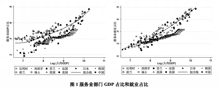 来源:钟粤俊、陆铭、奚锡灿(2020,管理世界)。根据ISIC划分三大产业,其中服务业是指除农业和工业以外的其他行业。人均GDP是按购买力平价的GDP比上总人口,统一换算成1990年的国际美元价格。