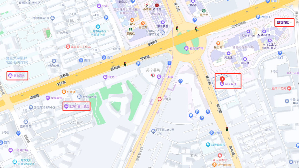 上海蓝天宾馆以及五角场附近其他宾馆的位置信息: