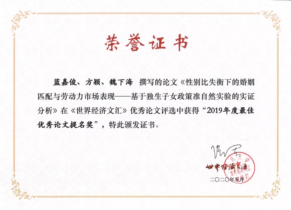 蓝嘉俊、方颖、魏下海,《性别比失衡下的婚姻匹配与劳动力市场表现——基于独生子女政策准自然实验的实证分析》,《世界经济文汇》2019年第4期。