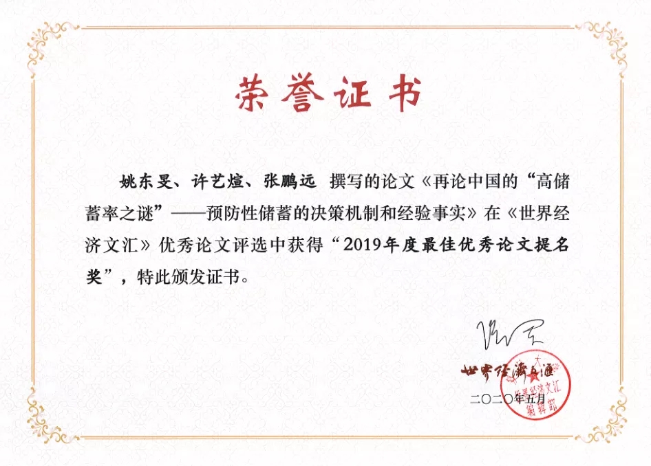 姚东旻、许艺煊、张鹏远,《再论中国的“高储蓄率之谜”——预防性储蓄的决策机制和经验事实》,《世界经济文汇》2019年第2期。