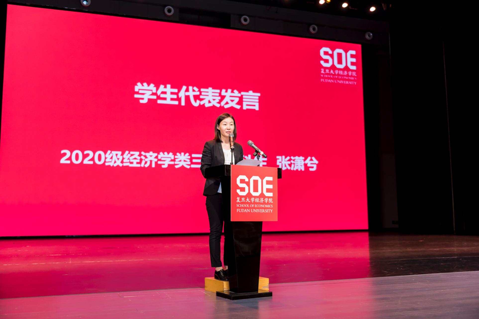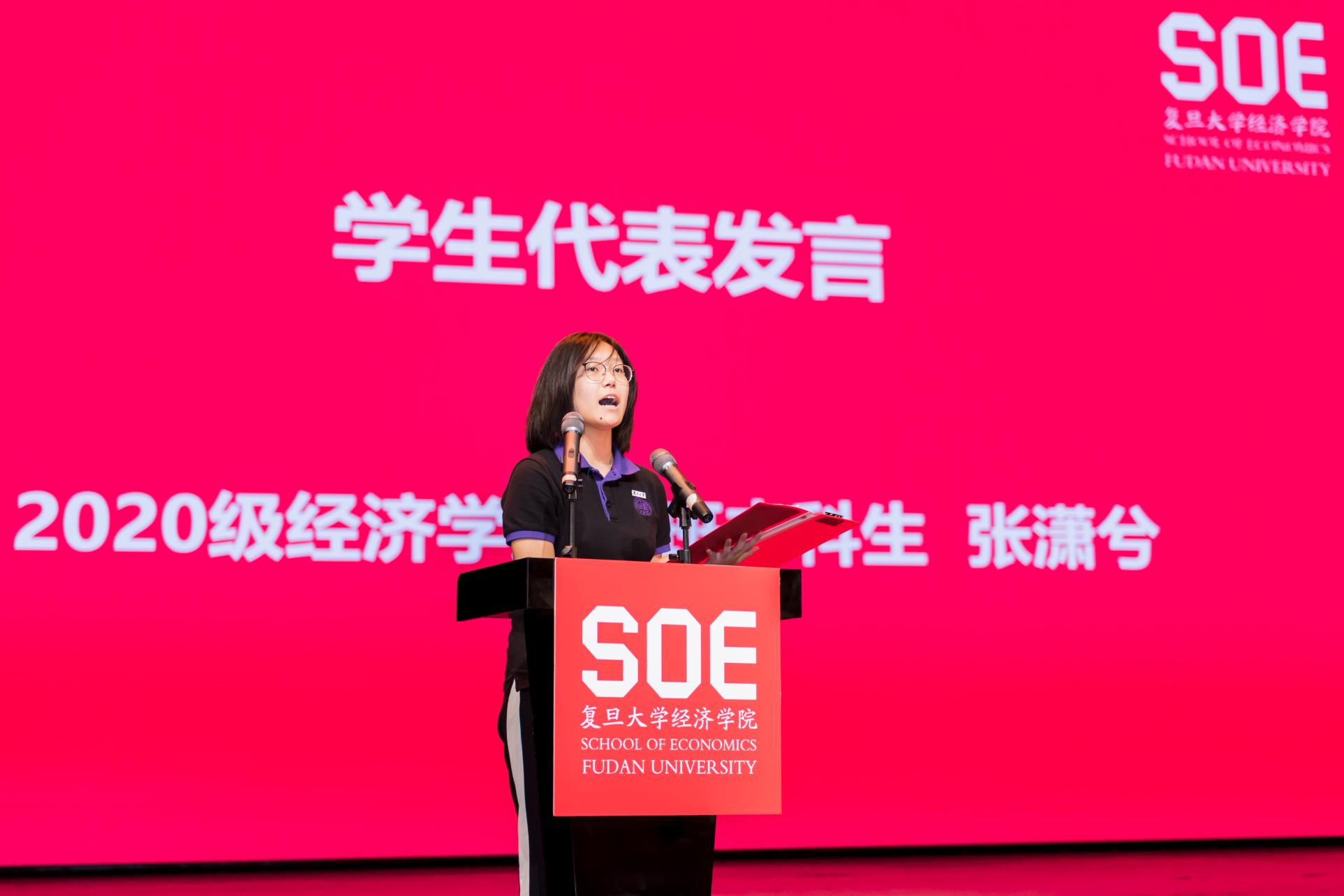 2020级经济学类三班本科生张潇兮同学代表本科生新生发言。她在发言时谈到马相伯、谢希德等前辈们为国家挺身而出,她深受感动,将坚守经院人“经世济民,生计百姓”的初心和使命,在国家最需要的地方服务奉献。