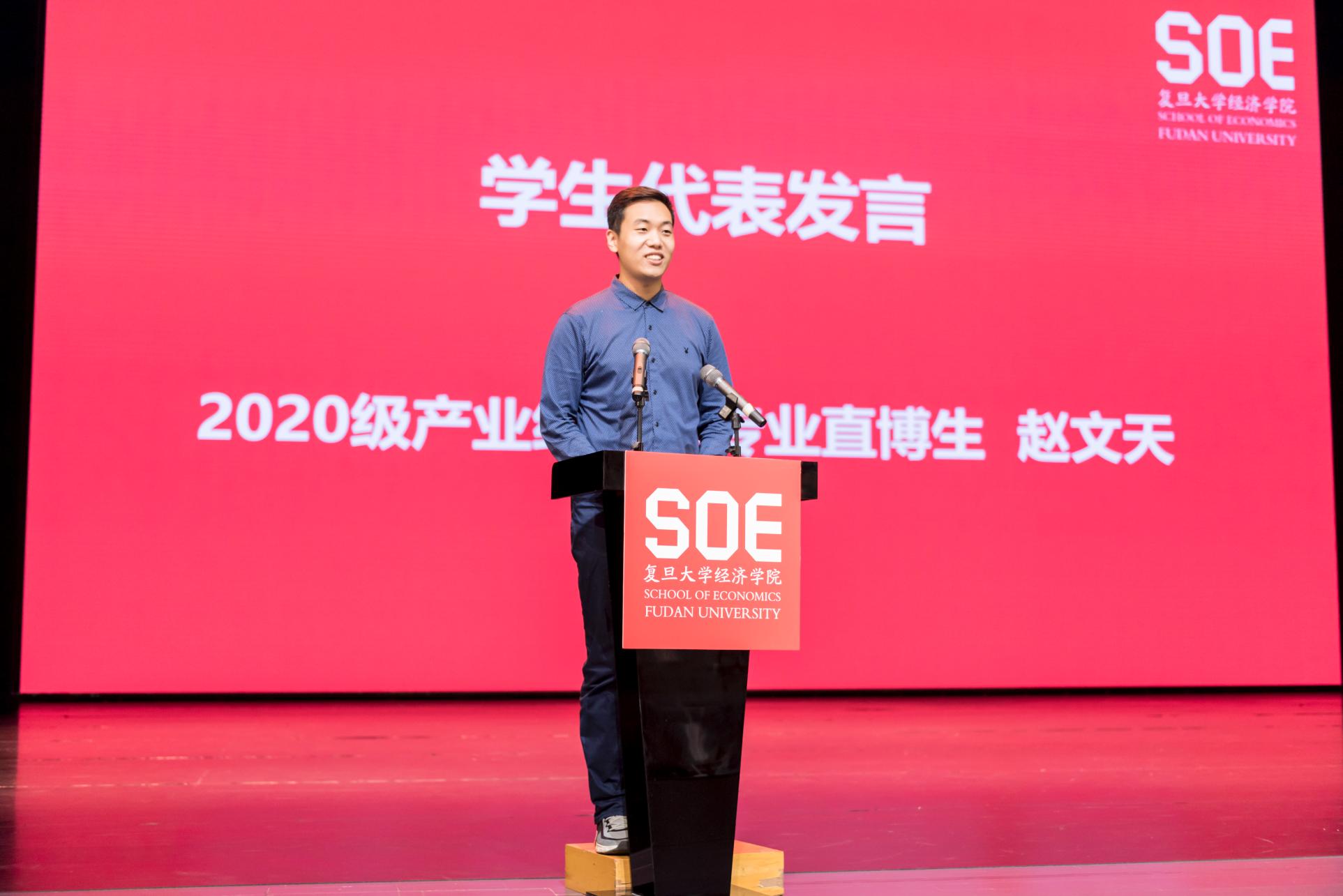 2020级产业经济学专业的直博生赵文天同学代表研究生新生发言。他将进入复旦学习定义为“圆梦”,同时也深知未来学术人生的大幕已经拉开,需要吸收更多的知识,付出更多的努力,才能实现理想和抱负。他始终关注着国家发展和国际形势,希望能够坚持科研,积极探索人类社会和专业领域中未知规律,为经济社会发展贡献力量。