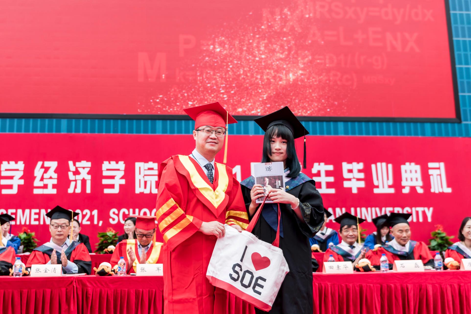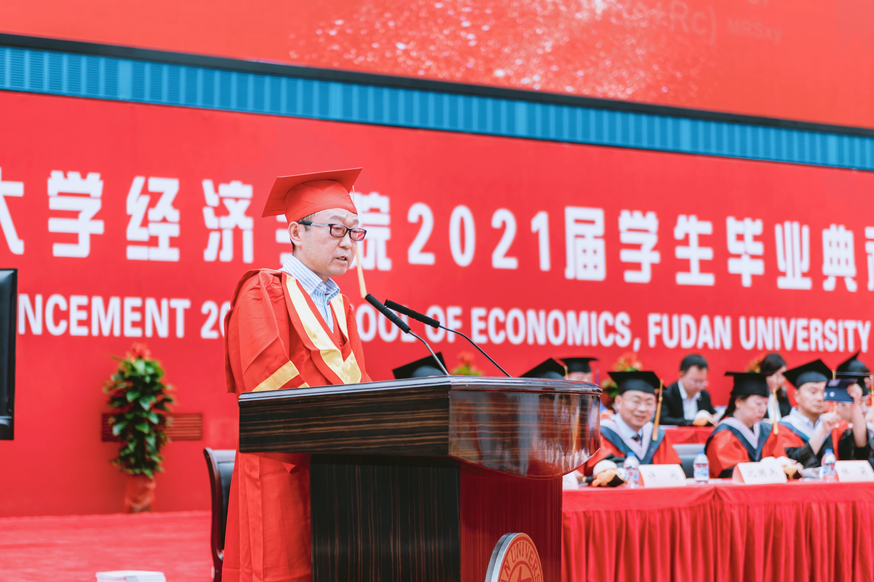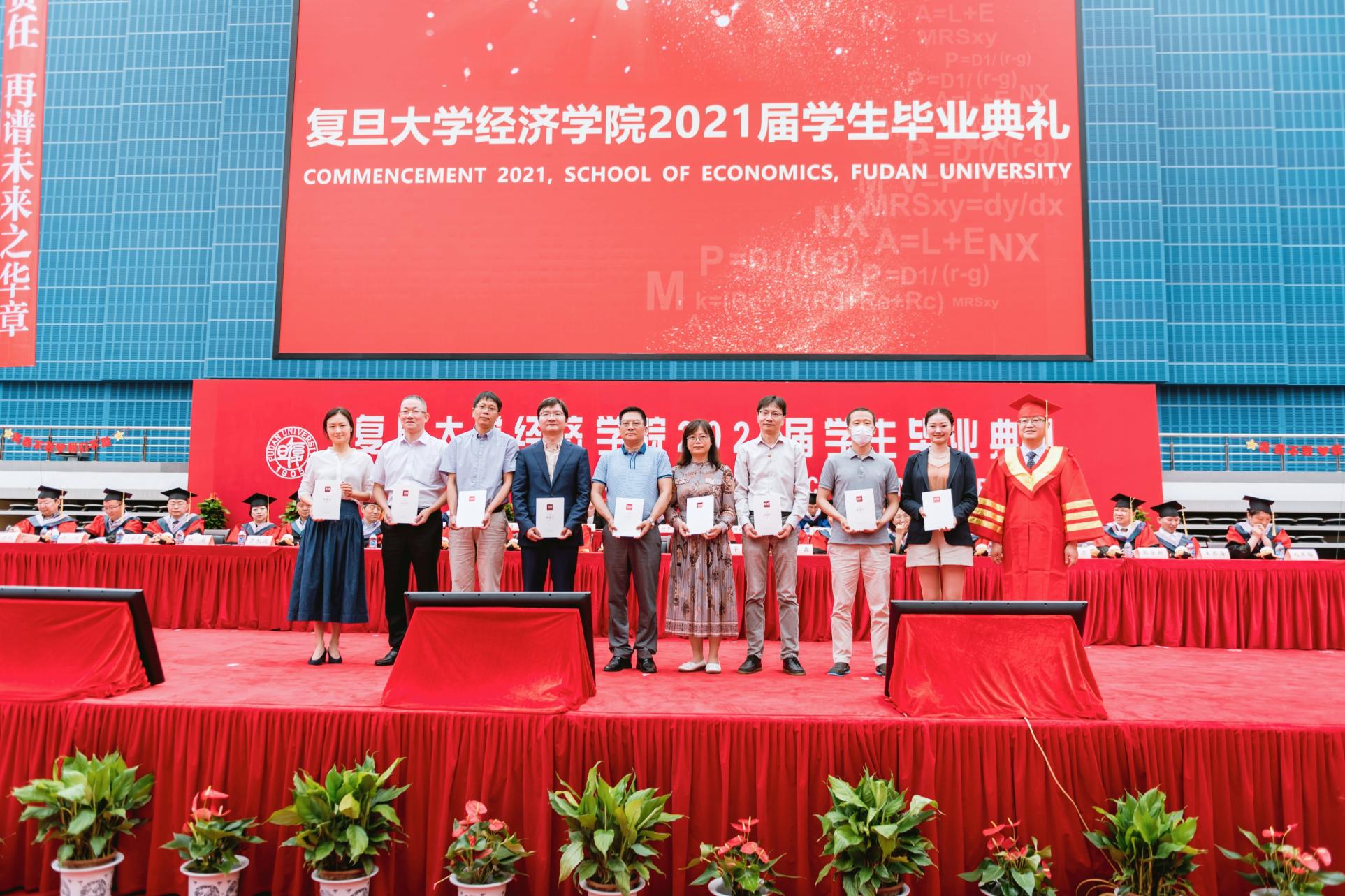 接着,隆重的学位授予仪式正式开始。就座在主席台的教师们为毕业生授予学位,并颁发毕业纪念册。毕业生学位帽上的流苏从右侧拨到了左侧,标志着同学们顺利完成了学业,即将走出校门,奔向锦绣前程,去追求新的理想。未来,毕业生将以校友的身份延续复旦经院人的梦想,开启新的奋斗征程,每一位校友都将成为复旦经院一张闪亮的名片。