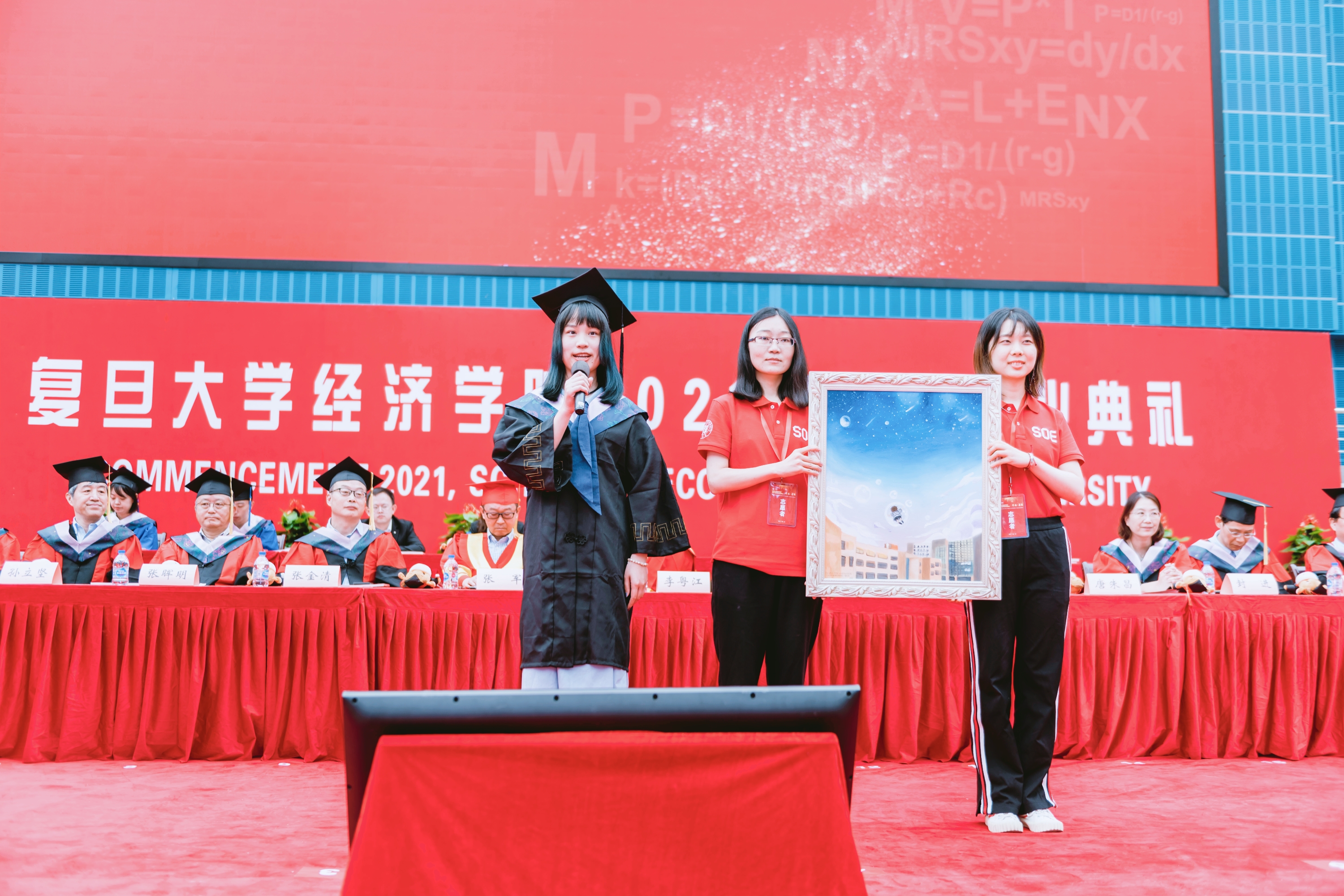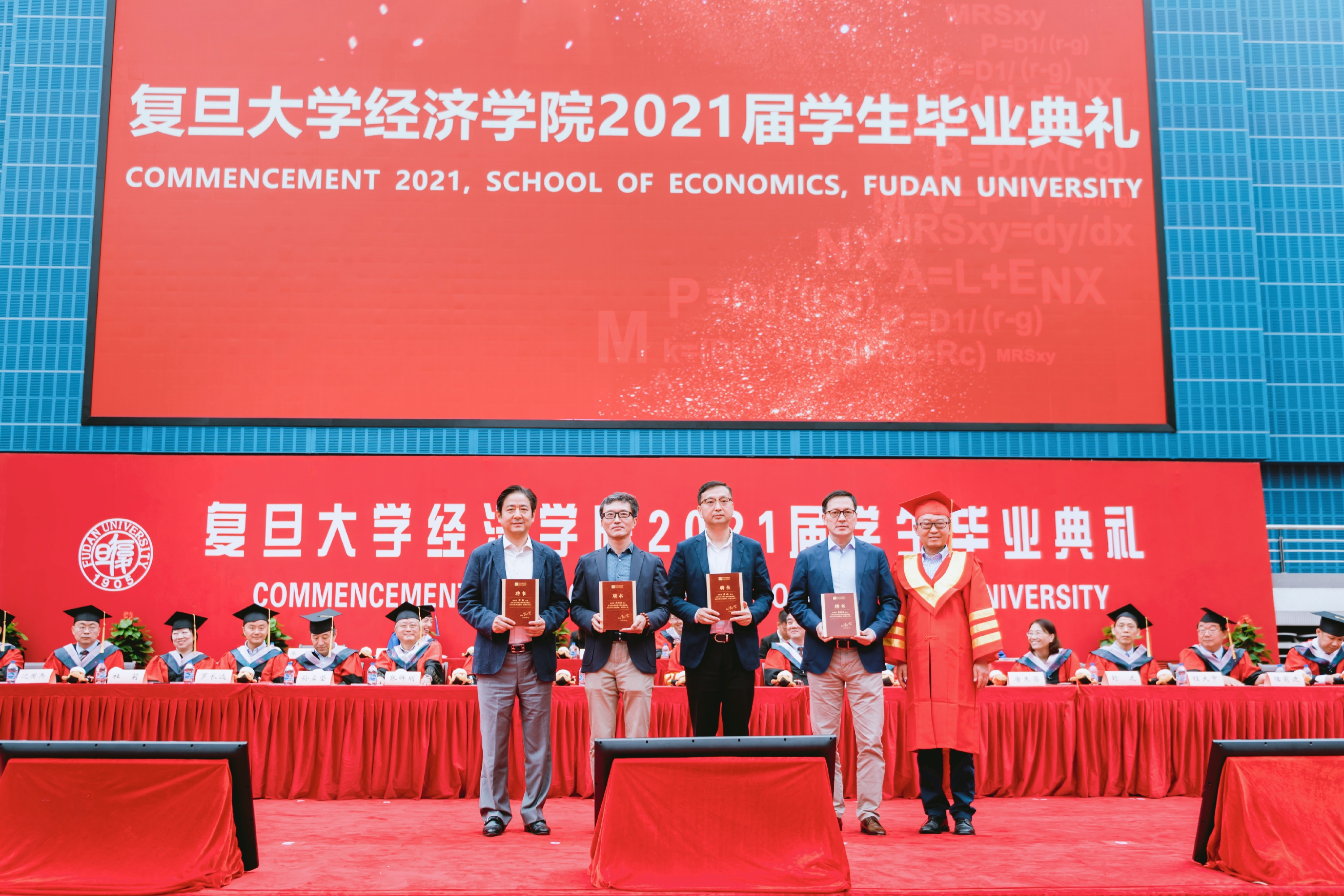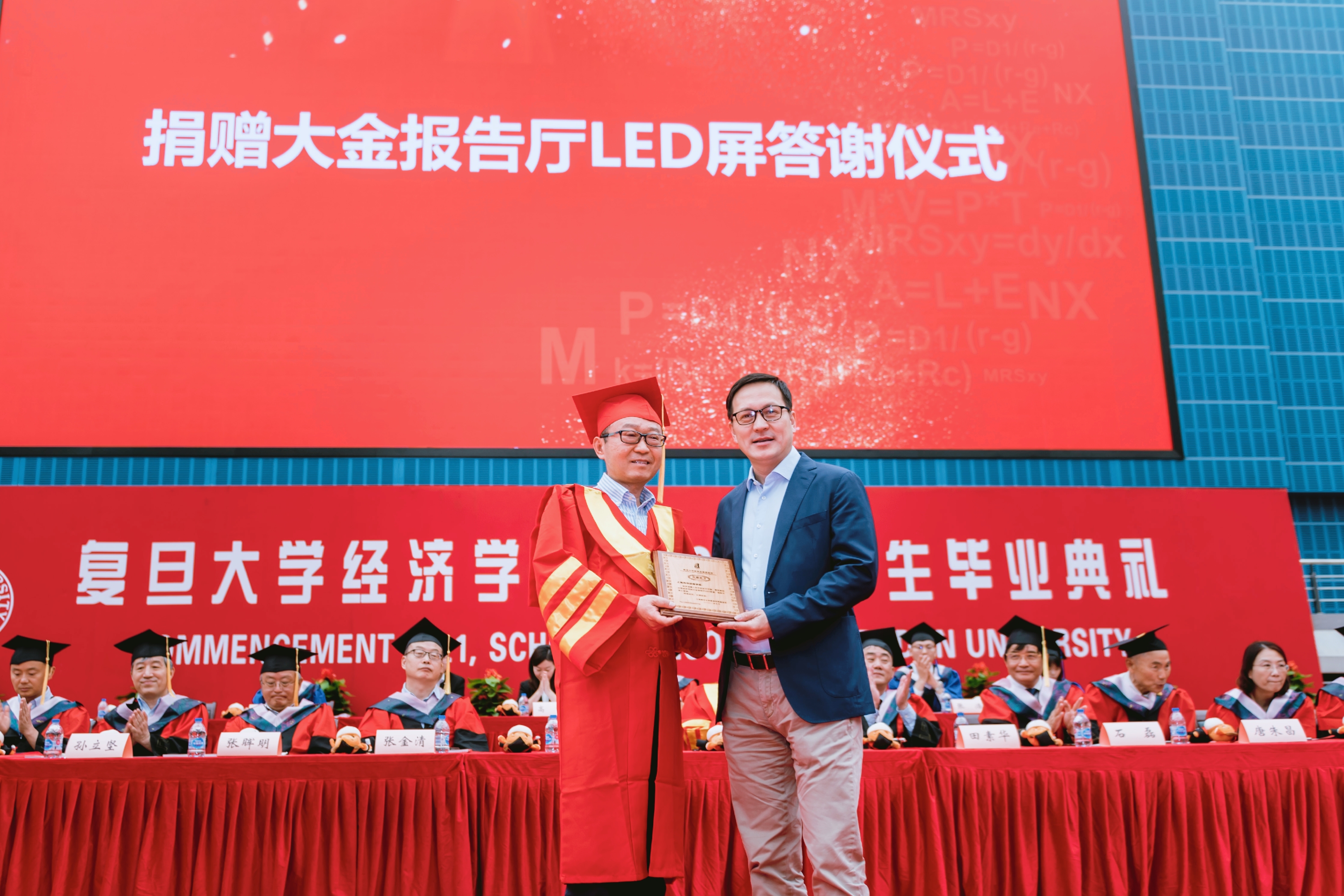 接着,隆重的学位授予仪式正式开始。就座在主席台的教师们为毕业生授予学位,并颁发毕业纪念册。毕业生学位帽上的流苏从右侧拨到了左侧,标志着同学们顺利完成了学业,即将走出校门,奔向锦绣前程,去追求新的理想。未来,毕业生将以校友的身份延续复旦经院人的梦想,开启新的奋斗征程,每一位校友都将成为复旦经院一张闪亮的名片。