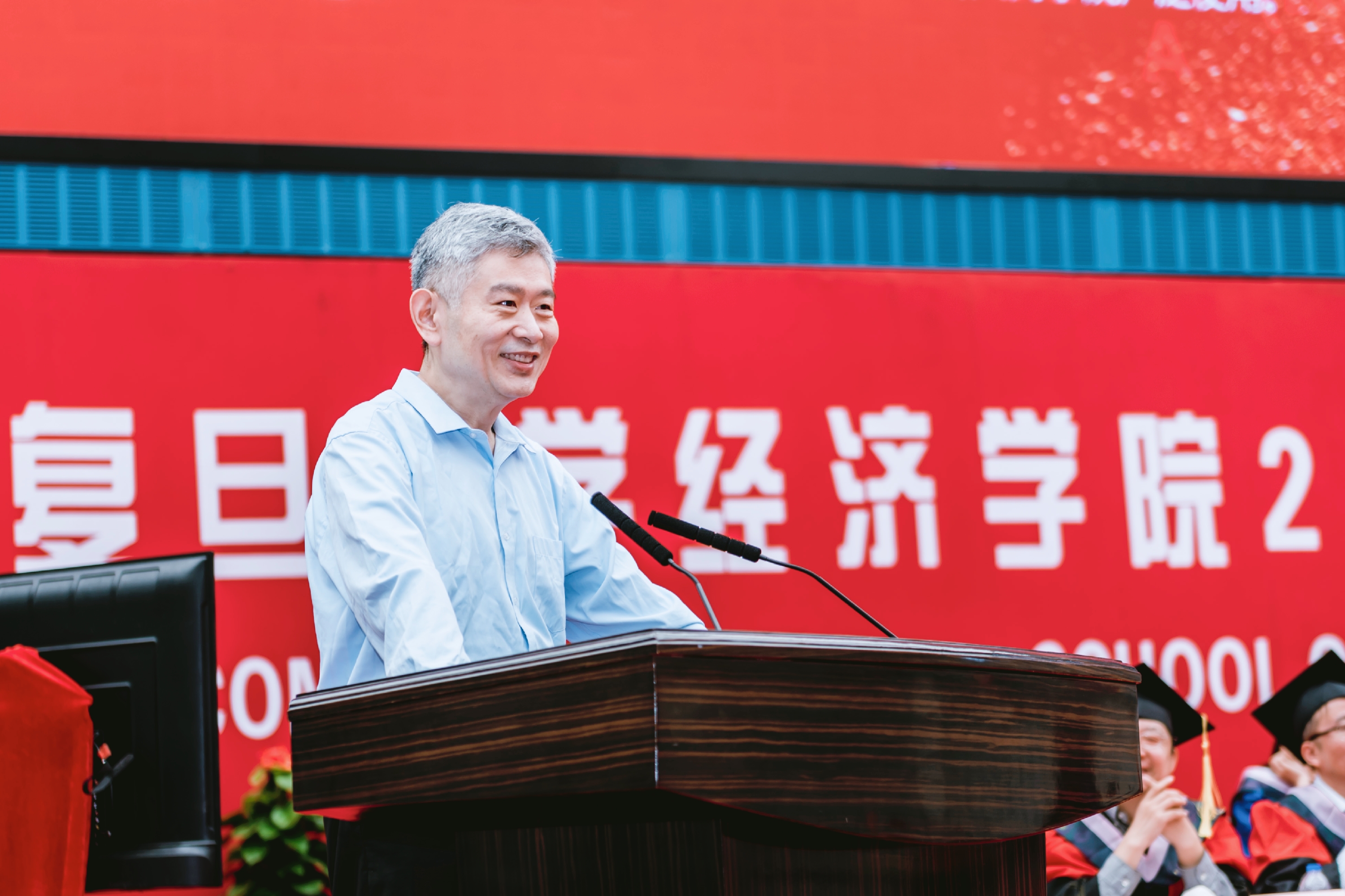 教师表示敬意,向一直以来支持复旦经院的各位来宾和校友表示感谢,向毕业生表示祝贺,随后与毕业生们分享了自己的经历。从如何与复旦结缘,到在大师云集、同学中藏龙卧虎的复旦经院求学,从本科毕业留校任教,到在国外留学任教并最终回国任教的经历,每一段都给毕业生们留下了深刻的印象。金李教授表示,“想到复旦就是想到温暖、敬重。复旦是我人生启蒙中最初的老师,复旦老师教会我怎么做学问,怎么做人”。他结合帮助中国民营企业的案例,向同学们介绍了自己所做的是“为中国未来的经济发展添加新的光和热”的工作,鼓励同学们勇敢面对挑战。最后,金李教授援引了张军院长的寄语,并以一句话结束演讲,“就像我和我这一代人一样,随着岁月的流逝,你们将来也会对复旦充满感恩,也会明白复旦的求学岁月对你们而言为什么弥足珍贵”。