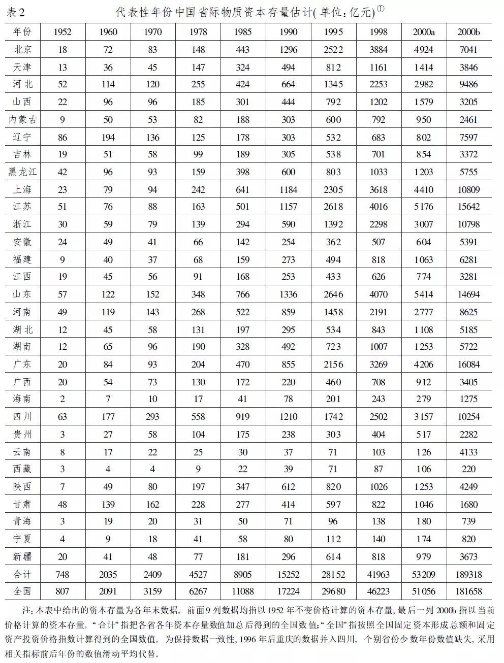 中国国内生产总值核算历史上,发生过两次历史数据的重大补充和一次历史数据的重大调整。第一次是对改革开放后的1978年至1984年数据的补充,这项工作是在1986年至1988年间进行的;第二次是对改革开放以前的1952年至1977年数据的补充,这项工作是在1988年至1997年间进行的。而第一次重大调整是在中国进行首次第三产业普查后的1994年和1995年间进行的。这两次补充数据和一次调整数据的详细资料主要发表在国家统计局经济核算司(1997)出版的《中国国内生产总值核算历史资料(1952—1995)》一书上。由于这本年鉴以及1999年中国统计出版社出版的《新中国五十年统计资料汇编》都包含了分省数据,并首次公布了一些重要的经济指标,所以为估计省际资本存量提供了客观条件。作者希望本文是对已有中国资本存量估算研究的补充和延续,并为今后相关研究提供比较全面和准确的数据支持。作者通过回顾和比较已有研究中国资本存量的相关文献,考虑到中国国内生产总值历史数据的几次重大补充和调整,对各年投资流量、投资品价格指数、折旧率/重置率、基年资本存量的选择与构造以及缺失数据进行了认真的处理和研究,并在此基础上利用补充和调整后的分省数据,根据永续盘存法估计了中国大陆30个省区市1952—2000年各年末的物质资本存量。部分数据如下: