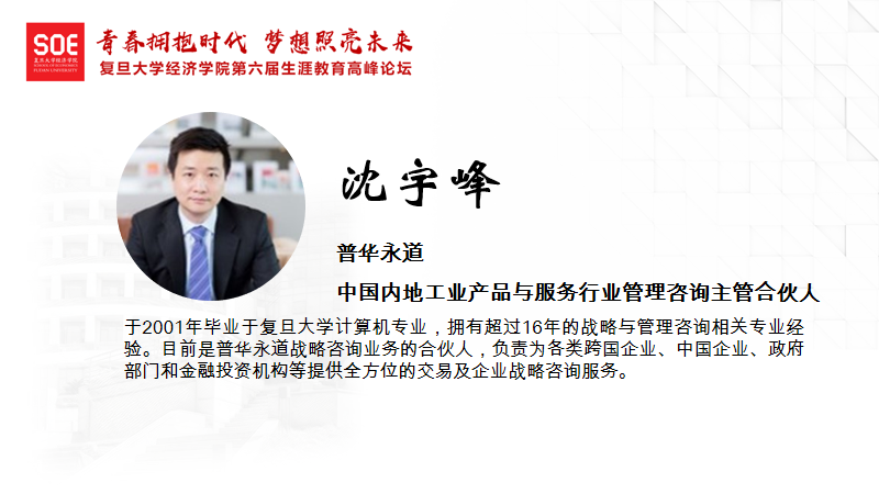 普华永道中国内地工业产品与服务行业管理咨询主管合伙人沈宇峰老师围绕着《咨询行业适合什么样的人?》进行了分享。首先,结合工作和招聘经历,沈老师为同学们介绍了咨询行业。广义来说,咨询是作为外部第三方进入企业,为企业提供答案。其次,从咨询人的特质而言,沈老师认为咨询行业从业者应该具备好奇心、逻辑思维、量化分析、沟通欲望及意志力这五大关键素质。接下来,沈老师指出,从行业发展而言,咨询行业的前景在于中国存在成长潜力巨大的市场空间,只要企业需要第三方的帮助,咨询行业就有存在的价值。最后,沈老师为大家分享了咨询顾问职业生涯各个阶段的不同侧重点。他指出,在顾问阶段通用咨询能力更重要,进入项目经理阶段后更需要采用假设驱动的方法进行工作,合伙人阶段则需要聚焦特定行业领域。