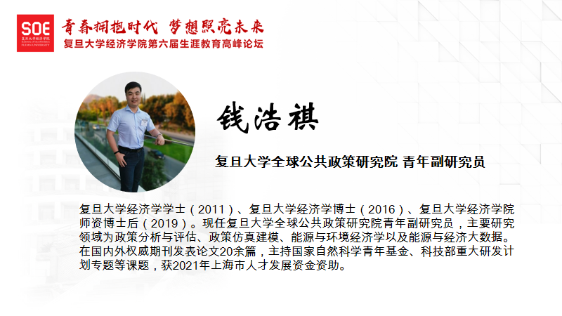 全球公共政策研究院青年副研究员钱浩祺老师进行了题为《多学科交叉融合背景下的学术机遇与挑战》的分享。首先,对于去学界还是业界的问题,钱老师认为大多数同学都会将学界和业界看作完全不同的两个领域,但学界和业界在不同节点有许多的联系和交流,因此同学们应该综合需求、能力和兴趣三个角度进行考虑。接下来,钱老师对多学科交叉融合趋势进行了说明。他指出,在研究更大背景的问题时,不应拘泥于学科分类,应该将多种学科进行融合,主要表现为“研究主题交叉化、研究方法交叉化以及成果发表交叉化”,经济学也在这样的背景下不断从交叉化的角度发展和实践。最后,钱老师指出,多学科交叉为同学们带来了挑战和机遇:同学们可以涉及更广泛的领域主题,获得更多发展机会;但也需要学习更多学科知识,掌握更多分析工具。