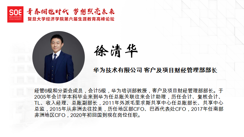 华为技术有限公司客户及项目财经管理部部长徐清华老师进行了《华为财经从应届生起步的发展之路》的主题演讲。徐老师首先就疫情和面试问题提供了相应的建议。关于疫情问题,徐老师建议同学们在疫情期间要充实自己、整理自己、装扮自己;关于面试,徐老师指出,同学们要学好专业知识,多去承担学校和社会的责任,并锻炼友谊和热爱的能力。接着,徐清华老师向同学们分享了自己在华为17年的历程与感悟。最后,徐老师介绍了华为的基本情况和持续成长的驱动力,并鼓励大家要持续学习。