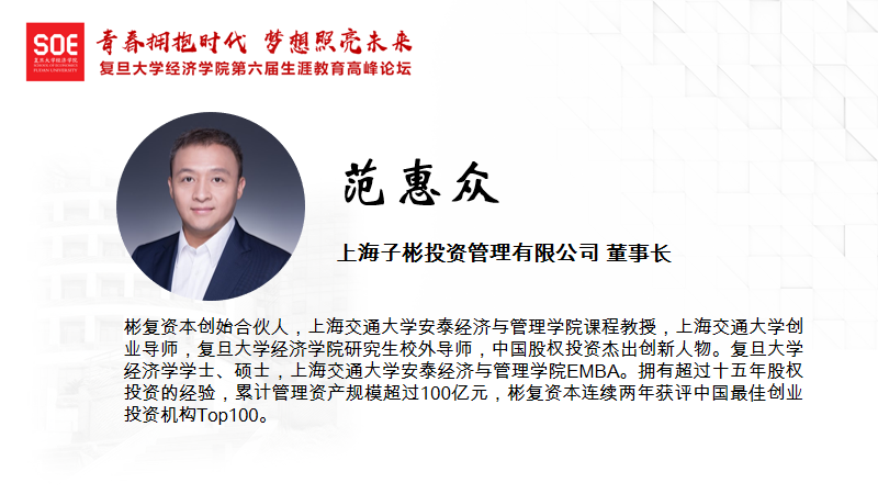 上海子彬投资管理有限公司董事长范惠众老师进行了主题为《应届生私募股权投资行业的成长路径》的演讲。范惠众老师从私募股权行业的工作内容、私募股权行业的前景、私募股权投资人需要具备的素养、如何进入私募股权投资行业四部分进行了阐述。范惠众老师指出,要想成为一个好的私募股权投资人,必须要把投资作为人生的目标。除此之外,成为一个好的投资人不是一蹴而就的,是一个漫长的过程,需要十年至十五年才能最终成为一个优秀的私募股权投资人。因此,范惠众老师建议想要进入私募股权投资行业的同学要有一个长远的职业规划,争取在毕业之后进入一个优秀的投资公司。最后,范惠众老师对未来进行了展望,相信未来私募股权投资领域会有持续的、健康的高速增长。