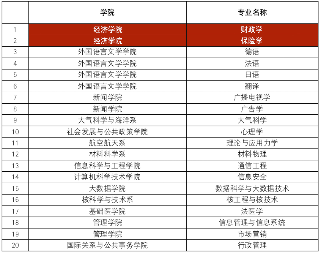 经济学(2019)、金融学(2020)、国际经济与贸易(2020)、财政学(2021)、保险学(2021)5个本科专业分三批全部入选国家级一流专业建设点。
