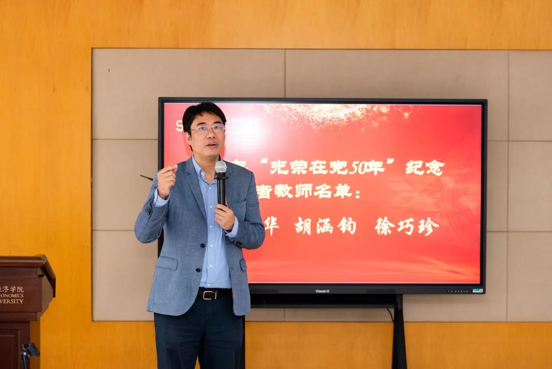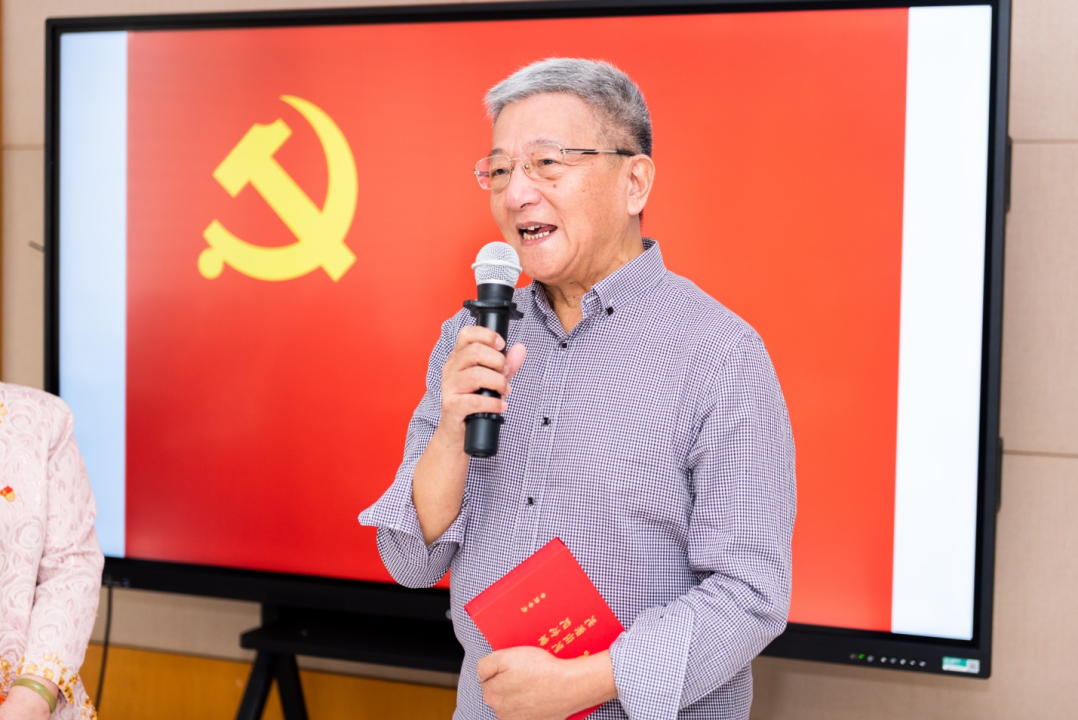 胡涵钧老师发表了感言。他感慨,一晃五十年过去,年轻时在港口码头上入党的场面还历历在目。回首过往、展望未来,可以用“继续努力,永葆青春”八个字来形容,希望在人生今后的路上继续做一个合格的共产党员。