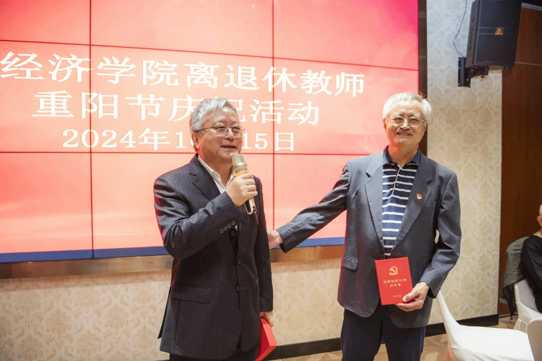 学院工会主席詹璐也对参加活动的老师表达了亲切的问候。学院的退休活动离不开党组织的引领和支持,在此次活动中有一个重要的环节就是向张晖明老师和焦必方老师颁发“在党50周年”纪念章。