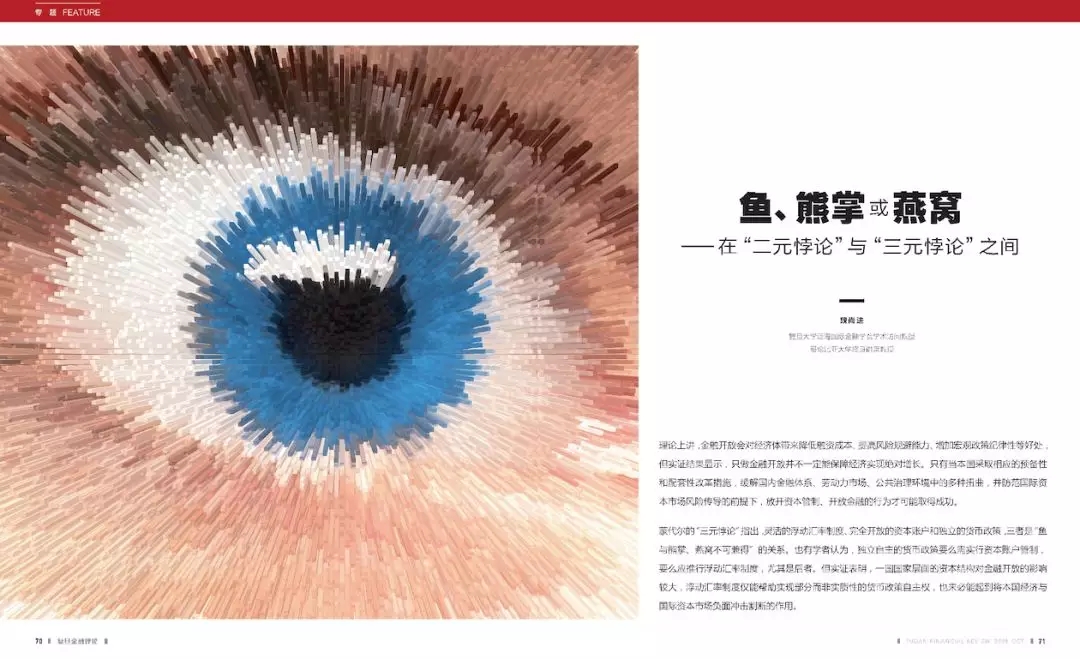 魏尚进教授为首期《复旦金融评论》撰写卷首语的同时,发表了题为《鱼、熊掌或燕窝——在“二元悖论”与“三元悖论”之间》的署名文章,将灵活的浮动汇率制度、完全开放的资本账户和独立的货币政策,比喻为“鱼与熊掌、燕窝不可兼得”的关系,并就“金融开放何以载舟?”、“制度不全的金融开放何以覆舟?”、“货币政策如何远离多事之秋?”三大问题做了深入浅出的剖析。