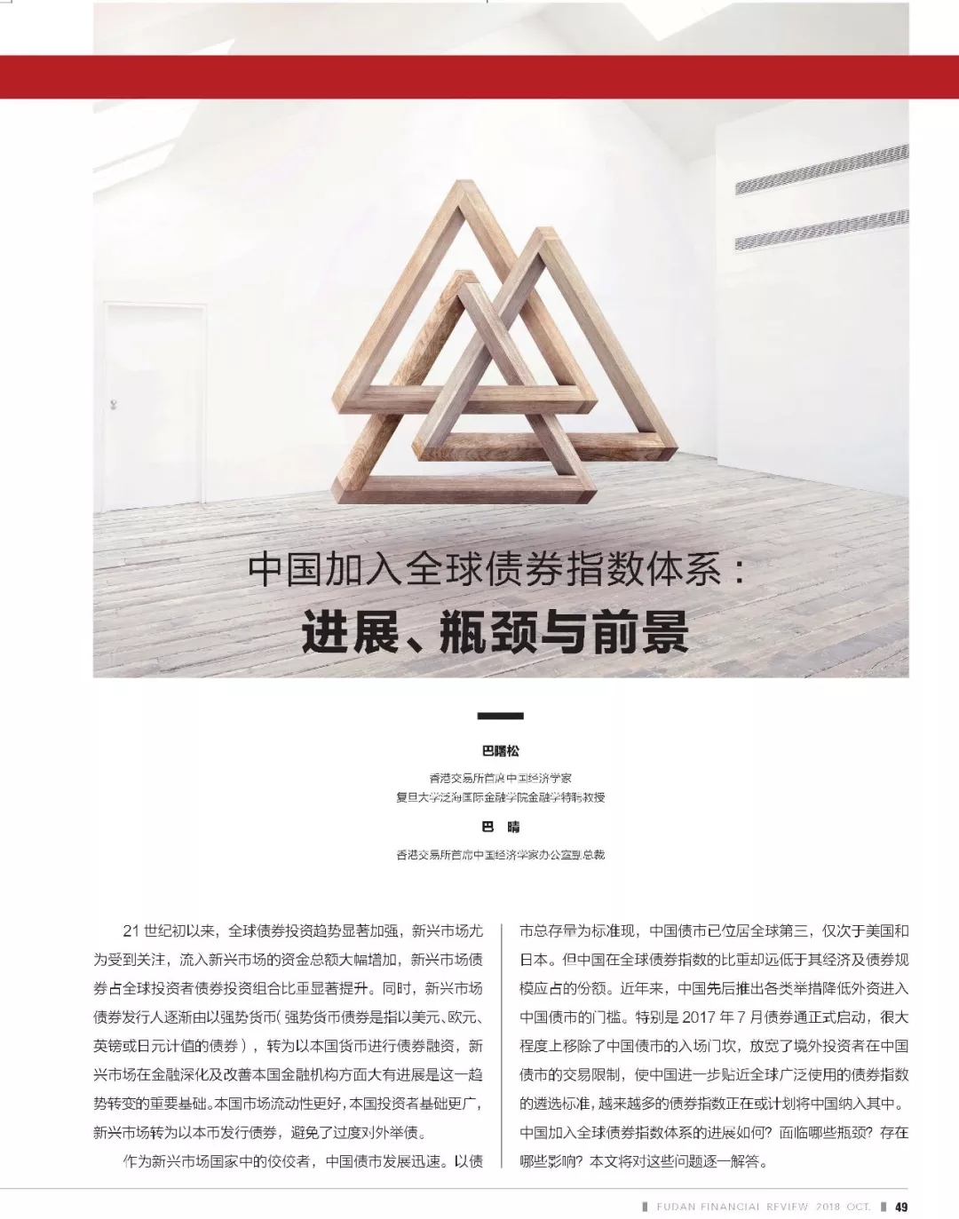 泛海国际金融学院金融学聘用教授巴曙松在首期《复旦金融评论》上发表的署名文章《中国加入全球债券指数体系:进展、瓶颈与前景》指出:作为新兴市场国家中的佼佼者,中国债市发展迅速。越来越多的债券指数正在或计划将中国纳入其中。中国加入全球债券指数体系的进展如何?面临哪些瓶颈?存在哪些影响?巴曙松教授在文章中逐一解答。