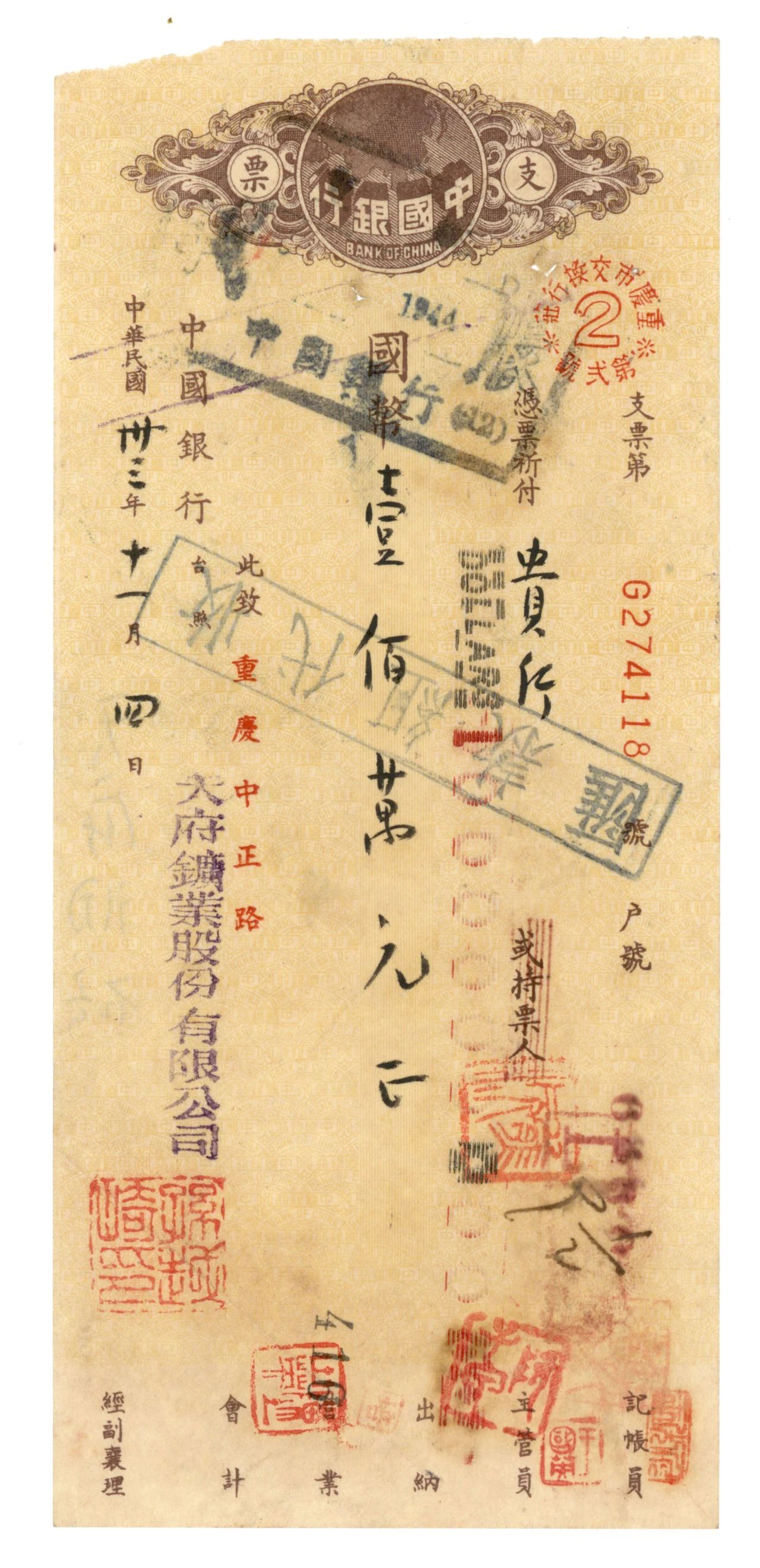 其中包括天府矿业股份有限公司、嘉阳煤矿股份有限公司支票,上面盖有总经理孙越崎印章。孙越崎是著名爱国者、实业家,御书屋