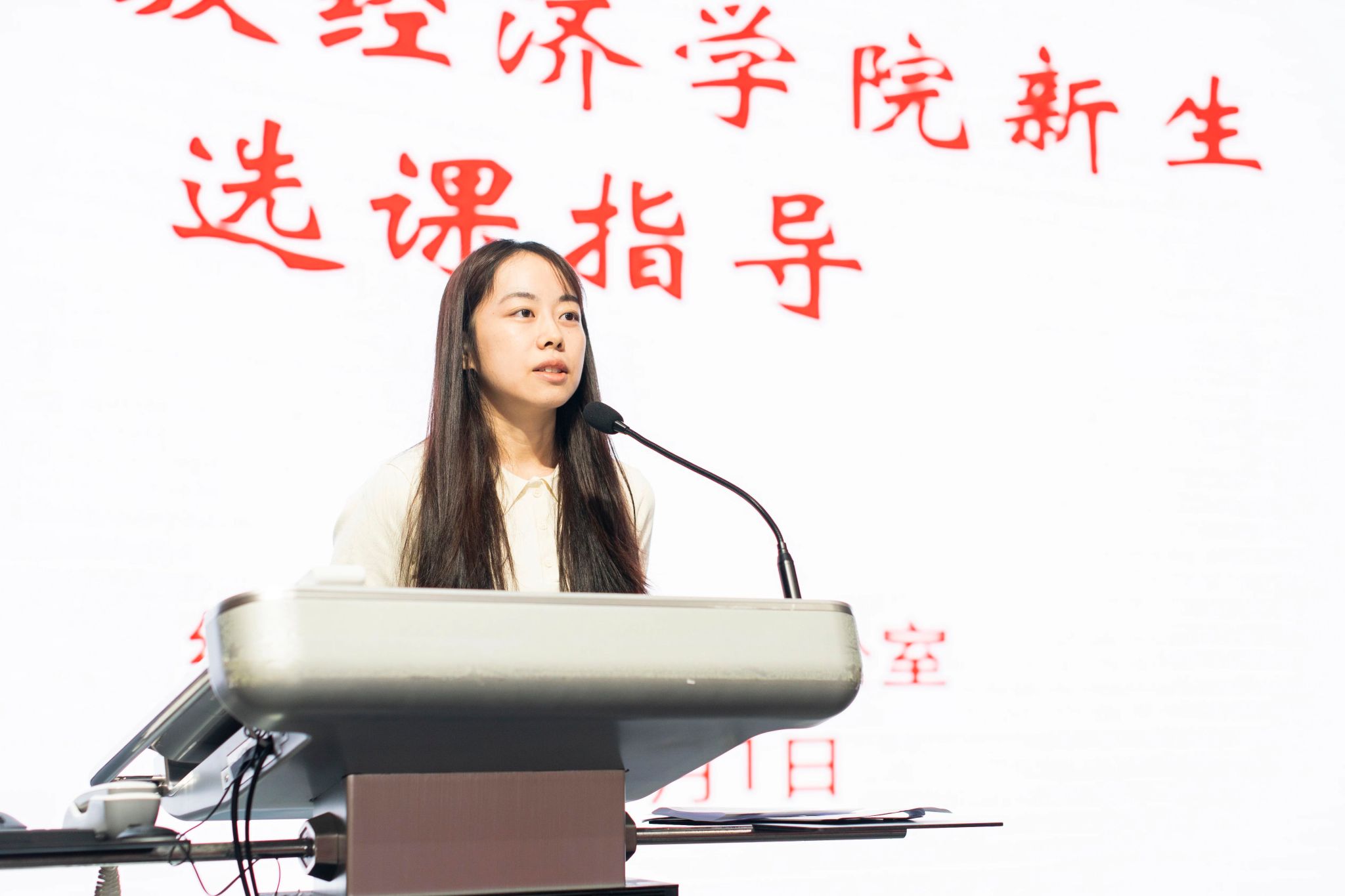 “2+X+Y”培养体系、课程设置及修读要求;本科教务办副主任张毅老师详细阐述选课流程以及注意事项;刘昊昱老师具体介绍本科生教学管理规定。同时本次会议邀请前教务办主任陈梅老师和数理经济拔尖班班主任、保险系的教学系主任段白鸽老师为新生答疑。