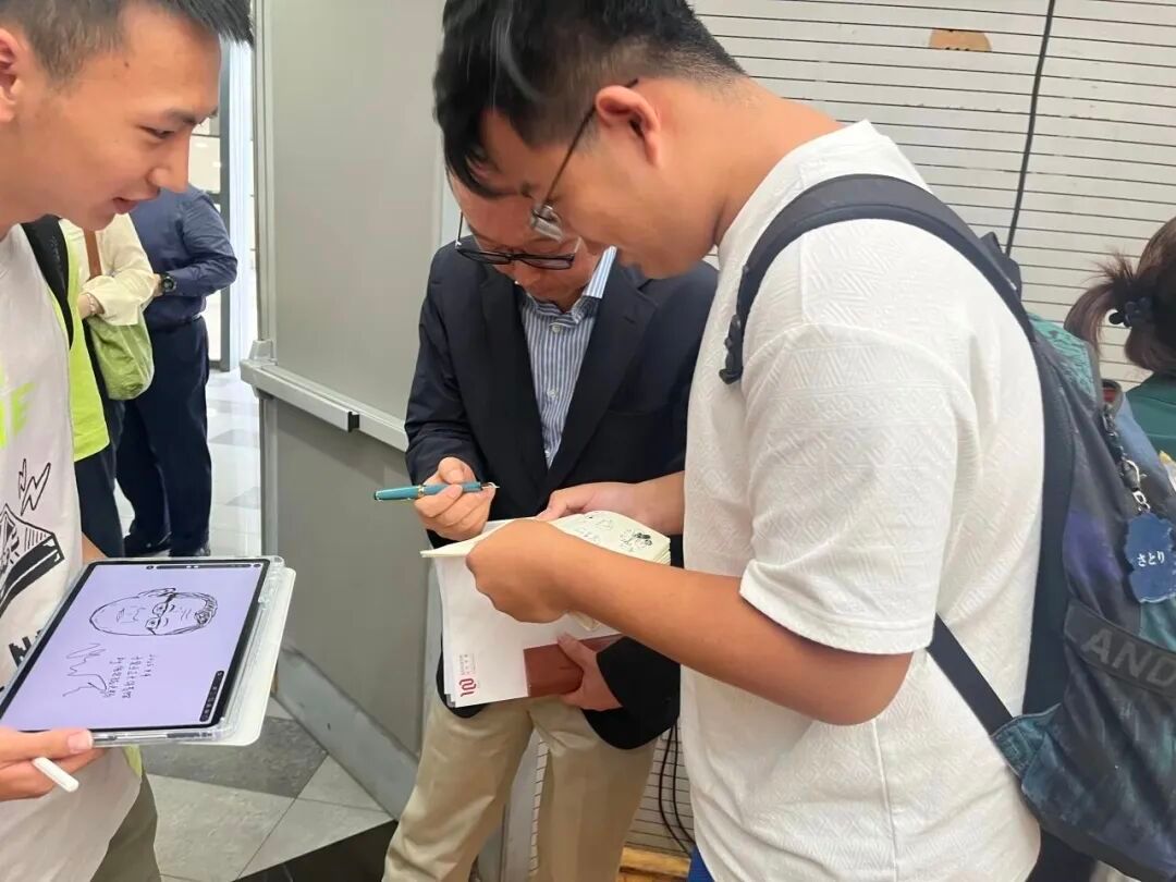 散场后,张军被同学们围了起来,2025级药学院学生吕佳轩带着给张军的手绘图画,来“求”合影。“张老师通过复旦四十年求学、讲学经历,传递了复旦人的气质。”25级临床医学五年制中山班的胡于森则请他为自己签名。“我和老师一样,每次参加大型报告或讲座,也总会请嘉宾留下签名。听到老师分享这个习惯时,特别有共鸣”,对他而言,张军的分享让他了解到大学生活真的可以既有趣又充实。“尤其是听到老师讲述他参加各类讲座、与不同的人交流、被大师们的学术境界和生活态度所感染的故事,让我更加相信,未来的五年,我也能把复旦的日子过得漂亮。”