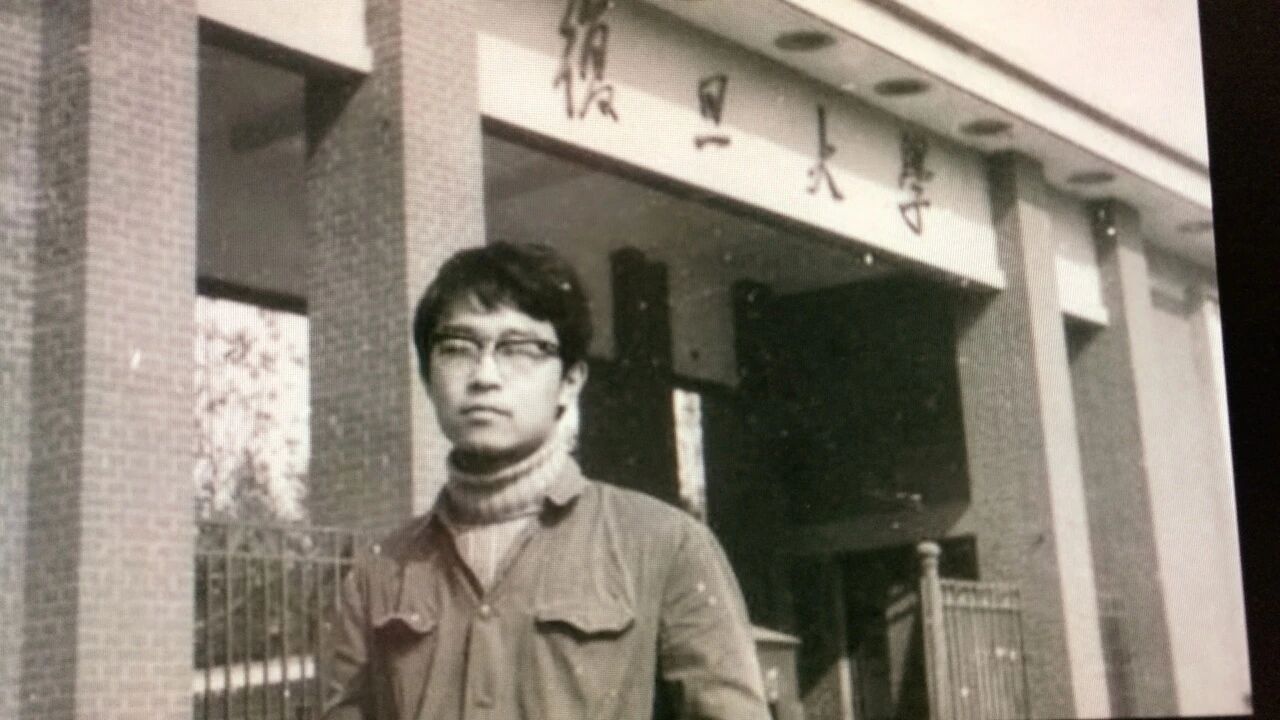 毕业生所赠,画面上的男子身着蓝色西装、戴着黑框眼镜,似乎是他年轻时的模样。
