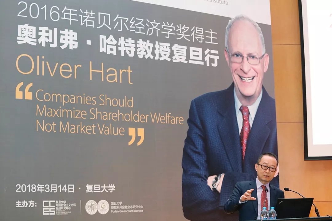 哈特教授演讲的主题为“公司应最大化股东福利而非市场价值(Companies Should Maximize Shareholder Welfare Not Market Value)”。哈特教授首先从弗里德曼在纽约时报上的一个观点展开,弗里德曼认为公司应该按照股东的意愿进行决策,那就是在不违背法律和社会道德的情况下赚尽量多的钱。但是,哈特教授认为股东并不是只关注公司的盈利能力,他们同时也关心公司的决策给社会带来的影响。随后,哈特教授用一个简洁而清晰的模型佐证了自己的观点。