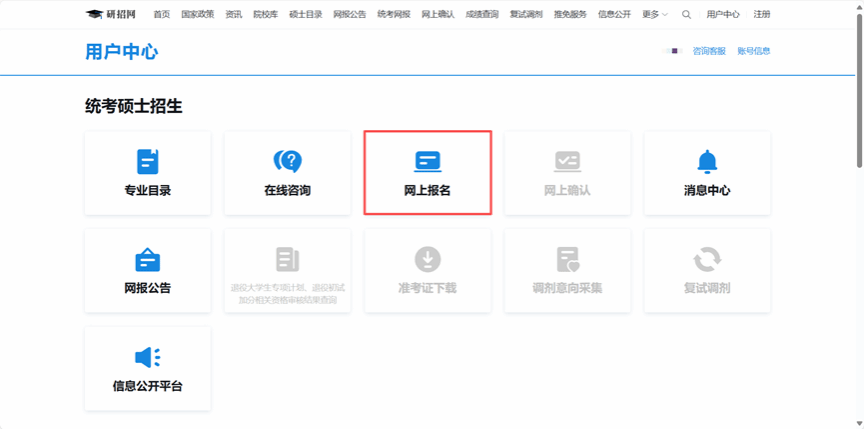 已注册考生:直接输入账号密码登录,点击主页“统考报名”按钮,选择“统考硕士招生”→“网上报名”,阅读《报名须知》后点击“确认”,进入下一步。