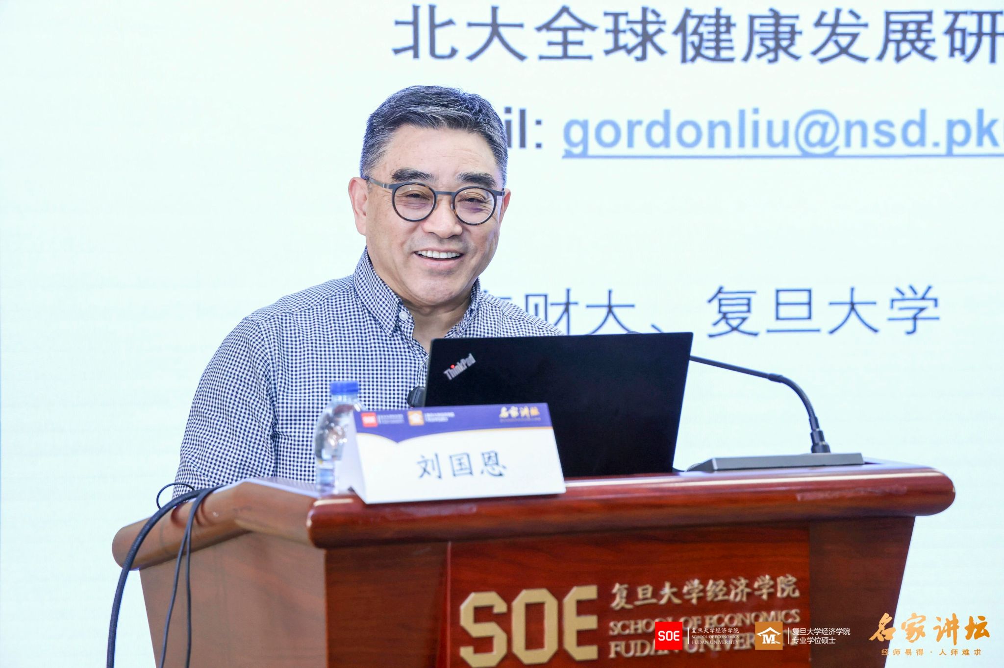 “名家讲坛”第108期、本学期第八次课程在大金报告厅开讲。北京大学全球健康发展研究院院长、北京大学国家发展研究院博雅特聘教授、中国医学科学院学部委员刘国恩教授面对御书屋