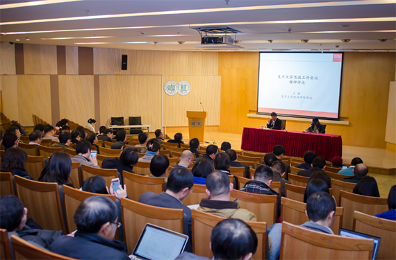 随后,学院党委书记石磊老师传达了教育部思想政治工作司司长张东刚开展的思政工作会议精神。石书记结合自身的理解,根据中央31号文对思政工作的主要内容做了十点解读,诸如“高校思想政治工作关系到高校培养什么的人,以及如何培养人,谁培养人”等。接着他又从“学科发展工作和思政工作要结合在一起”、“编写教材要与社会主义科学建设相结合”、“办好高校教育必须坚持党的领导”等角度阐述了思政工作的核心思想。