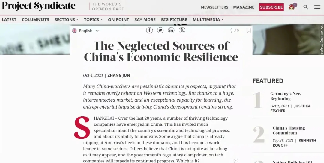 近日,张军教授在世界著名思想评论平台网Project Syndicate撰文“The Neglected Sources of China's Economic Resilience”。
