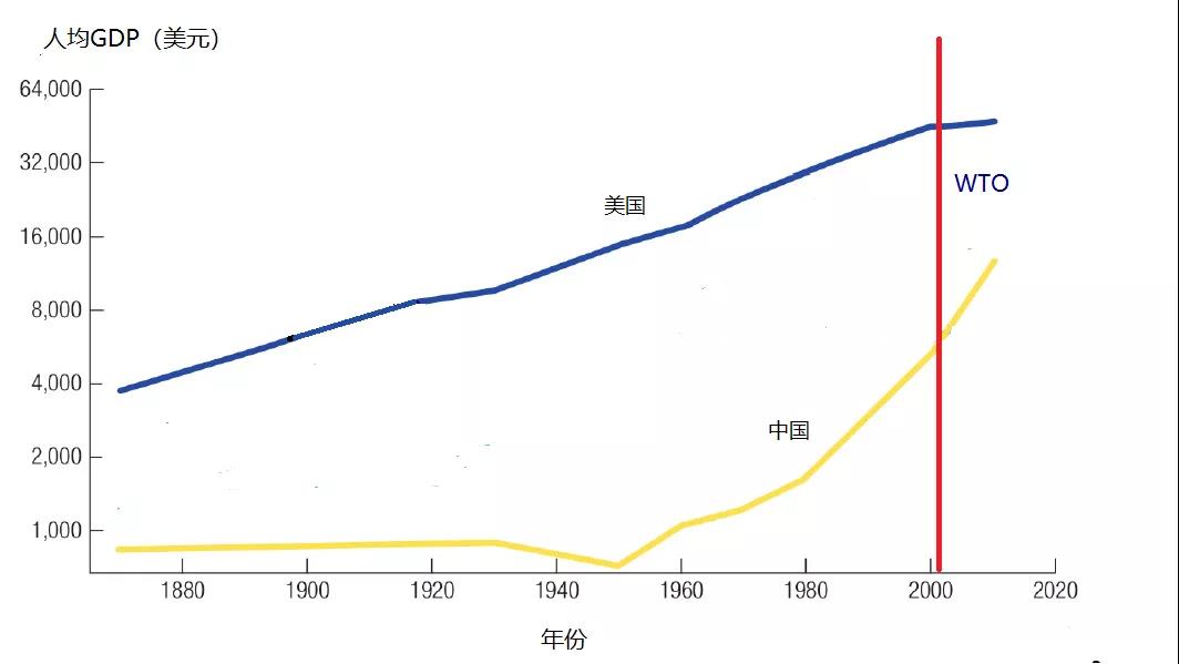 在图1里我们看到,加入WTO之后的十几年,是中国自清末以后的一百多年里,人均GDP提升最快的时期,大大拉近了中美两国之间的差距。而在清末以前,根据经济史学家的研究,中国长期处在马尔萨斯陷阱里,并没有实质性的经济增长。因此,也可以说,加入WTO之后的十几年,也是中国五千年历史上经济增长最快的时期。