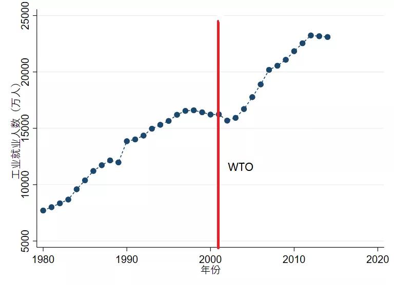 最后,“入世”既是远水,也解近渴。20世纪最后几年,中国的工业部门,在内部经受了改制的阵痛,在外部受到了亚洲金融危机的冲击。内外夹击下,就业形势极为严峻:根据《朱镕基讲话实录》,从1998年到2000年年底,国企下岗职工累计达2500万人。在图3中我们也可以看到,从1998年到2002年,中国工业部门就业罕见地下降了1000多万。然而,从2002年开始,工业部门就业出现了强劲反弹,从2002年的1.6亿一直上升到2014年的2.3亿。