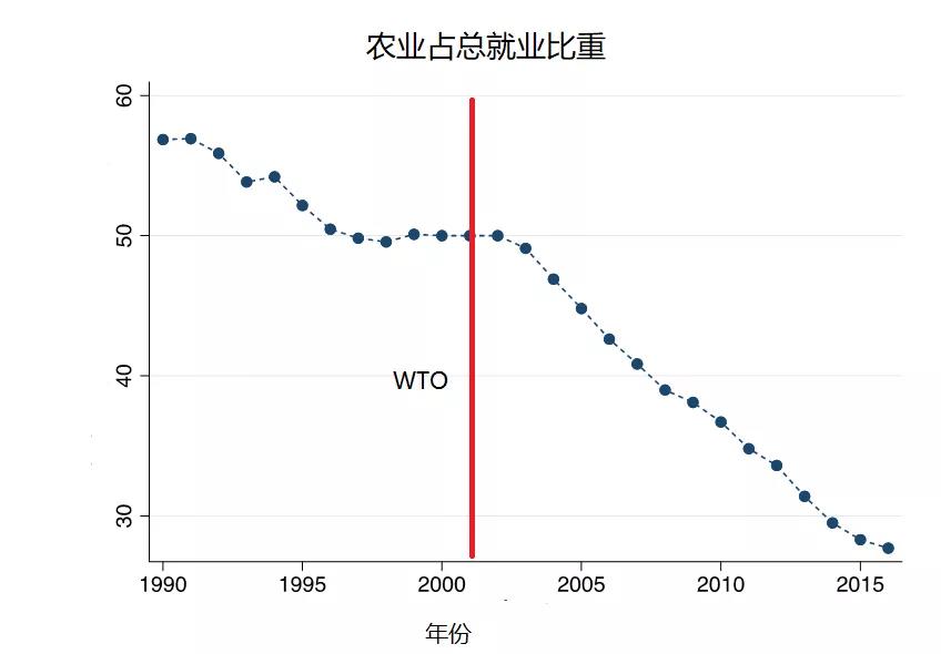 一个经济体的现代化过程,也是农业的重要性不断下降的过程。虽然农业是国民经济的基础部门,但如果农业在宏观经济中占比过高,那么这个国家就很难摆脱马尔萨斯陷阱。从图2中我们看到,中国经济快速增长的过程,同时也是农业的相对重要性不断下降的过程,但这一过程在“入世”之后大大加速了。前面我们所强调的人口流动和农民工数量的增长,是这里最为关键的因素。