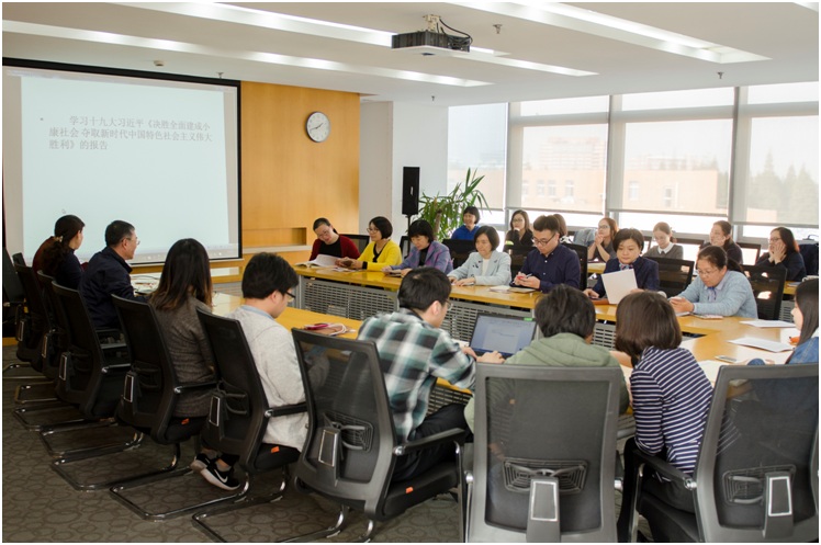 工会主席严法善教授,学院退休教师支部书记、退休教师代表王克忠教授。学习活动共分成上下半场,上半场为十九大报告的解读与分析主题讲座,下半场为支部党员老师十九大报告思想汇报与分享。行政党支部书记张琼老师主持此次学习活动,行政支部所有党员老师、部分预备党员及入党积极分子老师20余人参与十九大报告集体学习活动。
