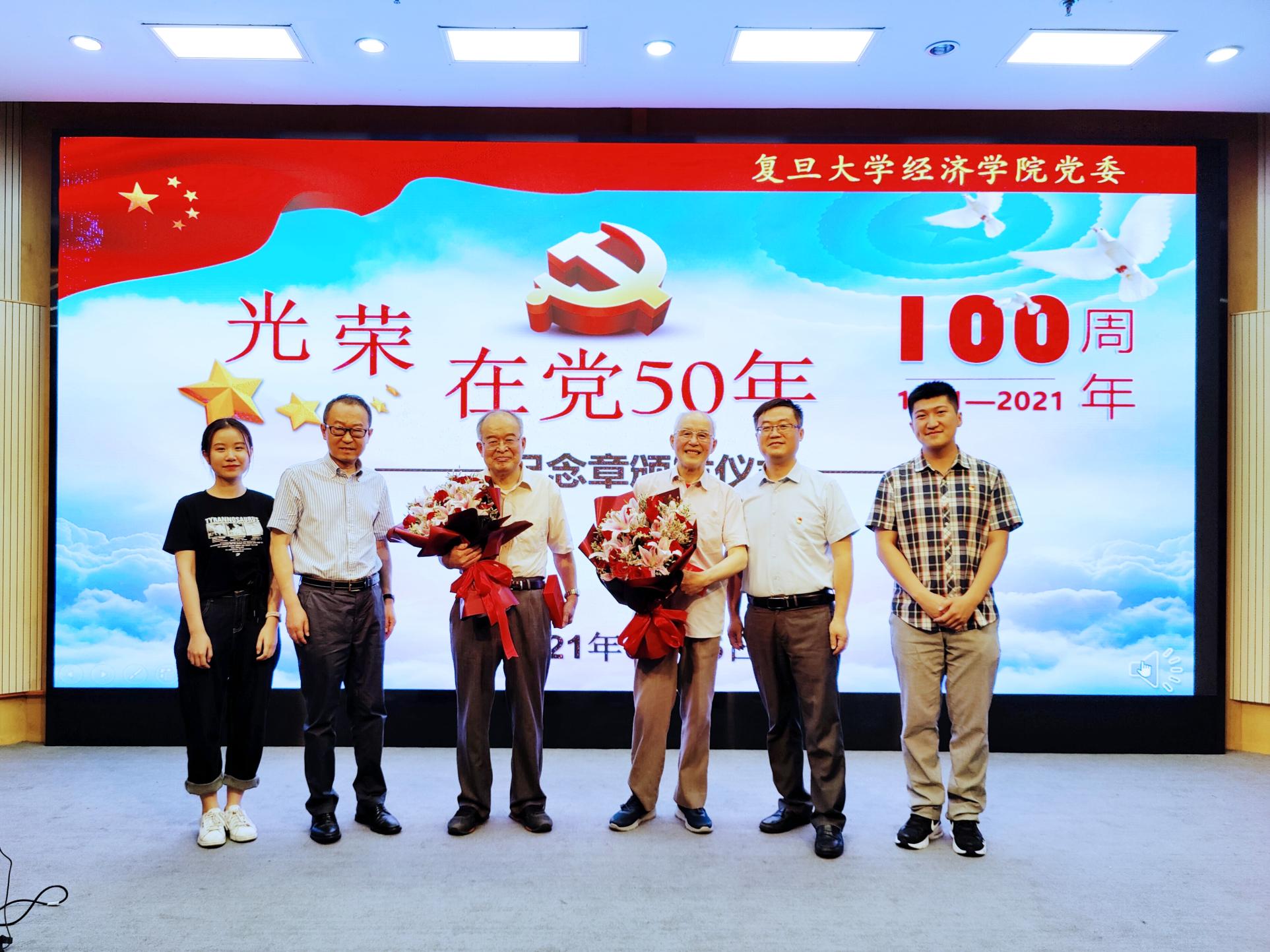 获得“光荣在党50年”纪念章的十五位党员名单。张军院长和李粤江书记分别为庄起善和邹根宝两位老党员颁发“光荣在党50年”纪念章并送上鲜花。