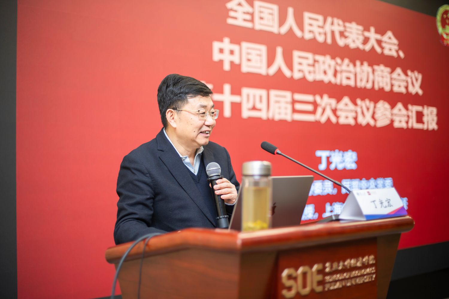 大金报告厅开展师生政治理论学习暨党员基本培训,邀请第十四届全国政协委员、上海中华职教社副主任丁光宏教授做2025年全国两会精神传达报告。会议借助御书屋