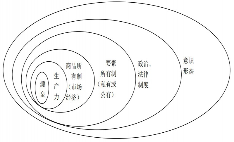 在生产关系两圈中,前圈市场经济,只问商品归谁所有,而不问生产商品的要素归谁所有,后圈才分为公有或私有。《资本论》论的是资本主义市场经济,是资本外壳中的市场经济。如果去其资本外壳,存其市场经济内核,再与社会主义外壳结合,就可创新为社会主义市场经济理论。这正是对《资本论》理论最重要的创新。