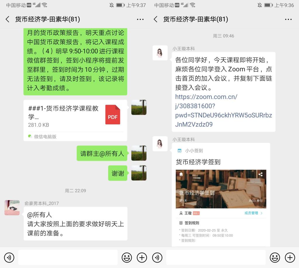 2月26日上午9:40开始,《货币经济学》课程助教在微信群发送“小小签到”程序,通知同学签到后进入Zoom会议。9点55分,田素华老师运用Zoom会议软件进行互动教学。课堂分教师讲解和师生互动环节。师生互动环节,田老师事先设计了若干选择题和问答题,点名让同学回答然后老师点评,还设计了讨论题,先由学生自主发言,针对题目进行深度发言及讨论,再由教师点评。整个过程有24个问题、40位学生参与了交流。