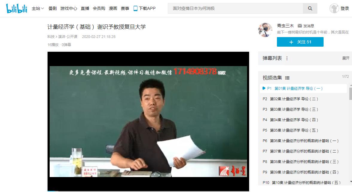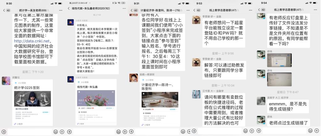 本周开设的平行班课程有《计量经济学》课程、《统计学》课程,教学团队都在网络课程准备阶段通过微信群进行了讨论、沟通,从视频录制、教学资源选用、到教材选用。《计量经济学》教学团队负责人是陈诗一老师。陈诗一老师组织教学团队共同讨论,统一使用谢识予老师的《计量经济学导论》视频。该视频由超星拍摄制作,在B站点击次数达到24.6万。每位老师根据自己的教学计划和特点进行个性化的录屏做补充,布置习题和答疑。《统计学》课程教学团队负责人是金飞老师。金飞老师目前还在湖北父母家,通过微信群组织教学团队进行讨论,选定课程资源及其他教学要点。