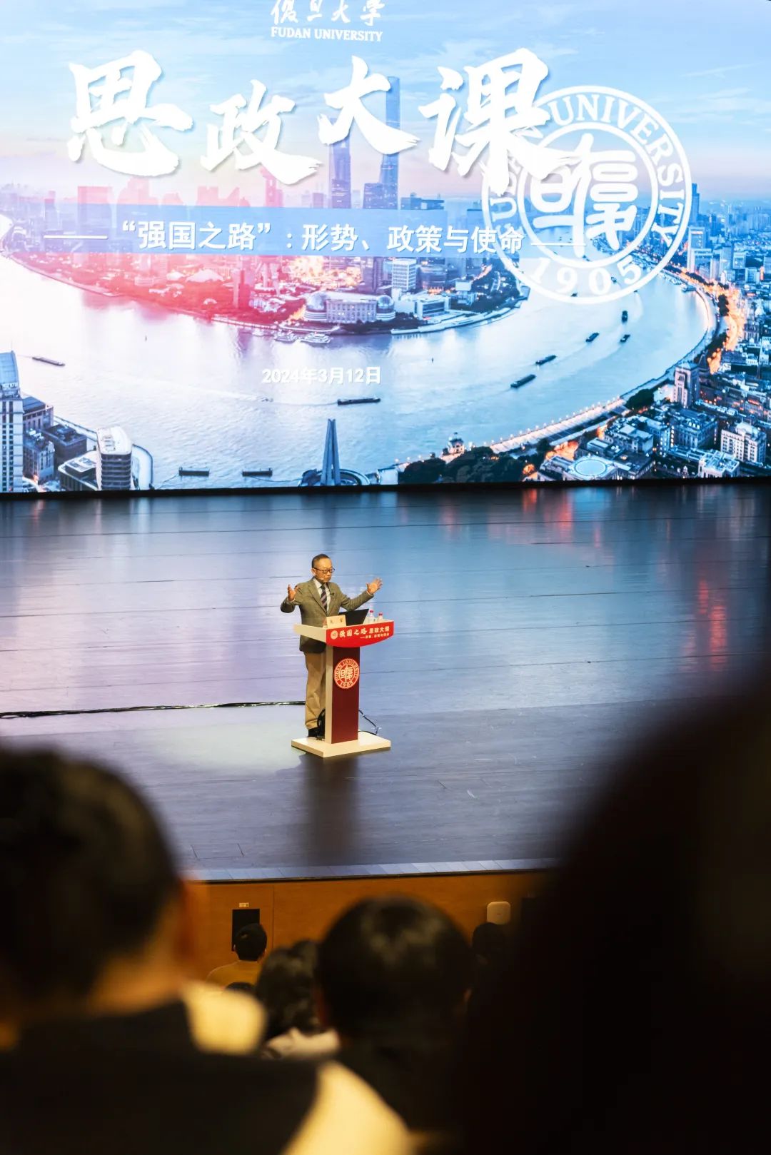 相辉堂北楼楼上楼下坐满了学生,二楼的同学也纷纷举手提问。老复旦人、经济 学家张军用两节课的时间,深入浅出讲述中国经济与形势,带来别样的思政大课,鼓励青年学子在时代的洪流中进行自主知识体系研究,传承、讲好中国故事。“请卓越的人讲有趣的事”,讲清楚中国式现代化的成功案例及其蕴含的道理哲理学理,让年轻一代复旦人掌握运用科学的世界观和方法论去认识观察世界、分析解决问题,熔铸报国强国的魂魄,正是“强国之路”思政专题大课的初衷。