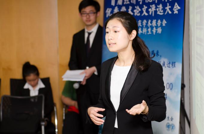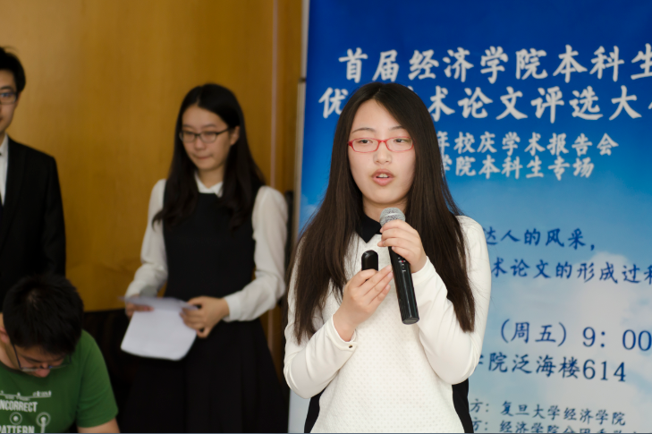 首先由刘瑾同学向各位评委就自己的论文作了简要介绍,她与秦若冰同学合作的论文题目是《中国基础设施投资经济效益分析》。刘瑾同学的报告条理清晰,选题角度独特,对两类不同的经济设施所产生的社会效益以及其区域区别分析到位,获得了现场老师的一致赞誉。