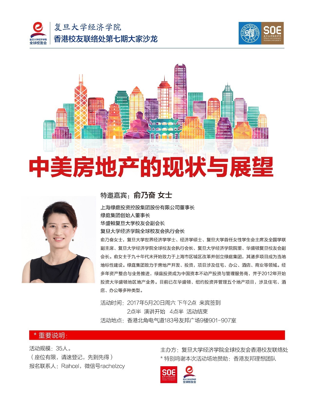 院董、华盛顿复旦校友会副会长。俞女士于九十年代末开始致力于上海市区城区改革并创立绿庭集团,其诸多项目成为当地地标性建设。绿庭集团致力于房地产开发、投资,项目涉及住宅、办公、酒店、商业等领域。经多年资产整合与业务推进,绿庭投资成为中国资本不动产投资与管理服务商,并于2012年开始投资大华盛顿地区地产业务。目前已在华盛顿、纽约投资并管理五个地产项目,涉及住宅、酒店、办公等多种类型。