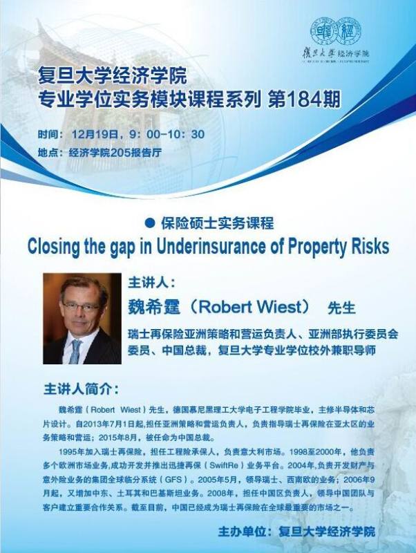 瑞士再保险亚洲策略和营运负责人、中国总裁、校外导师魏希霆(Robert临御书屋 ,在205报告厅主讲保险硕士实务课程,主题是《Closing the gap in Underinsurance of Property Risks》。