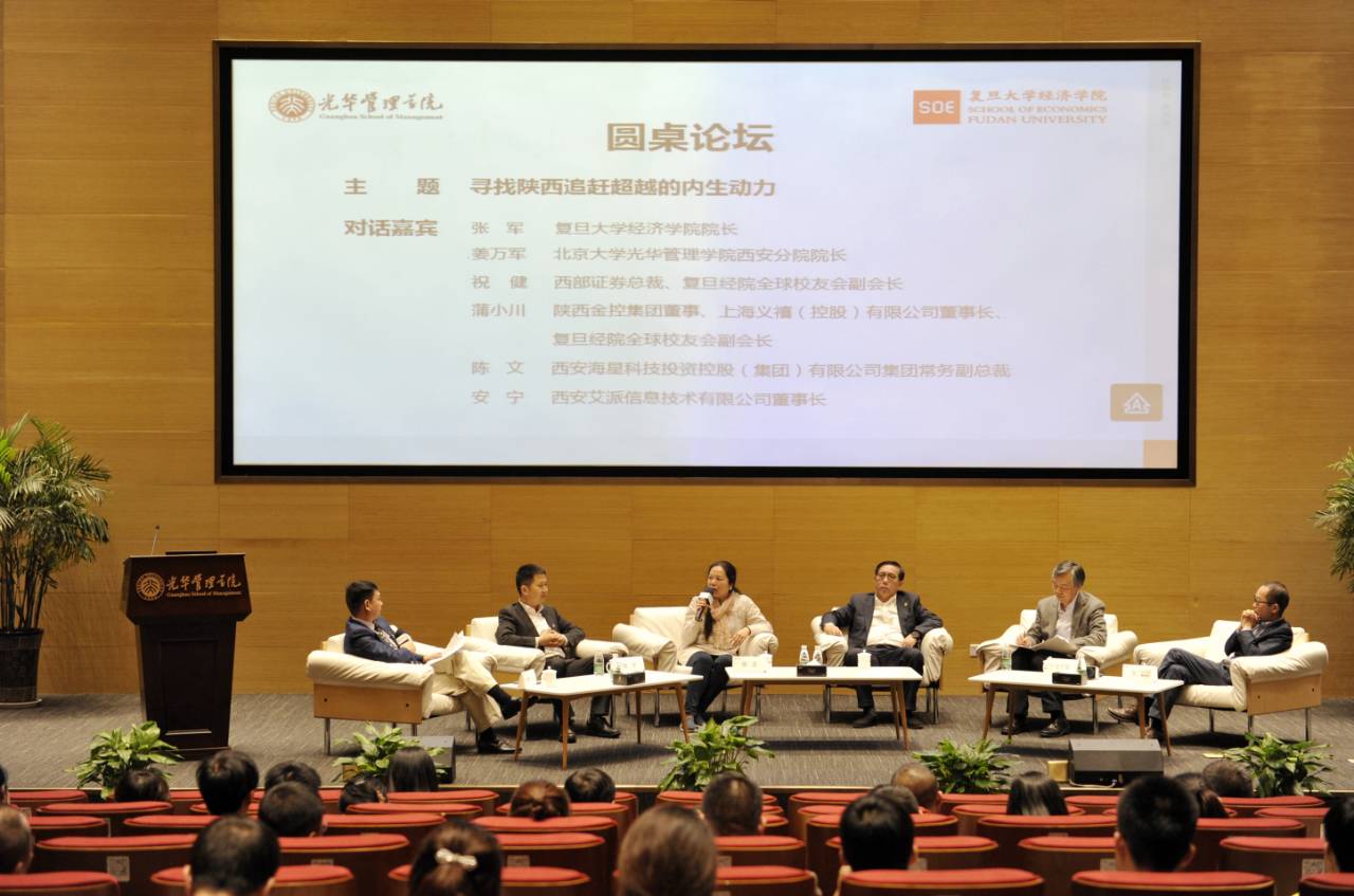 最后一个单元是圆桌互动环节。张军教授、姜万军教授、赵定理会长、西安海星科技投资控股(集团)有限公司集团常务副总裁陈文、西安艾派信息技术有限公司董事长安宁和主持人蒲小川参与了这一环节。圆桌互动的第一个题目是寻找追赶超越的内生动力。对西安情况比较熟悉的两位企业家安宁和陈文认为,目前西安的内生动力还存在不足,需要寻求政策和制度创新,同时需要长远着手培植企业文化和职业精神。赵定理会长、姜万军教授和张军教授也结合上海、北京和深圳等地的例子对这一问题进行了讨论。第二个讨论的题目是“院校的研究和金融机构以交易为目的的研究,究竟有什么不同?应该怎么去把控?”张军院长认为院校里面大多数学者的动机是出于好奇心的钻研,姜院长也指出大多数学者是靠自己驱动自己的,对两类研究者应该有不同的引导方式。
