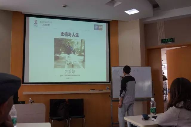 随后,余校友给大家介绍了太极拳流派的理论知识。太极传说于道家张三丰时期,但现在公认的太极拳的鼻祖则是陈王庭,其家乡被称作陈家沟,是太极拳的发源地。现阶段主流的太极拳主要有陈氏太极拳、杨露蝉的杨式太极拳,以及戚继光所著《纪效新书》、《三三拳谱》里的赵太祖的太祖拳等,虽然名称招式不同,但是力道要素是相通的。要学习好太极拳至少需要十年时间,但是对于业余爱好者而言,一套八五架子做到神形兼备也要一年左右的时间。接着余老师给大家推荐了王宗岳的《太极拳论》,并且告诉大家学拳之前要先明理,想要学好太极拳都应该看看这本书。所谓“拳者,权也”,即学拳是各种方面的权衡,身体应该达到“阴阳开合”的境界。他还向大家介绍了一种动力与作用机制与太极很像的俄罗斯武术systema,该武术讲求三个方面,即呼吸顺畅、放松和结构完整。