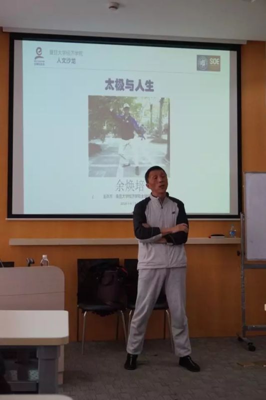 接下来余焕培校友为大家分享学习太极拳的人生经历。作为一个从小体弱多病的人,他在学生时期就想以体育锻炼的方式改变体质,但是效果并不理想。大学时代曾跟随上海数名拳击家系统学习拳击,坚持数年后在一次比赛中受重伤而放弃这项运动。经过一年多的病痛忧郁纠结,遇到了一位太极明师,学习了杨式和陈氏太极拳,走上了太极拳的漫漫研习之路。他对于太极拳的练习中途有过断断续续的经历,在结合了人生的阅历与太极的研修之后,他认为好的太极拳具有三个功能:一是具有修复功能,可以对身体塑形、对免疫机制进行修复;二是可以改变人的心境;三是可以练习身体的能量,按摩内脏,达到调性、调心、调息的功效。同时,他还指出,学习太极拳就像骑自行车一样,是掌握了之后即使多年不练也可以随时捡起来的。