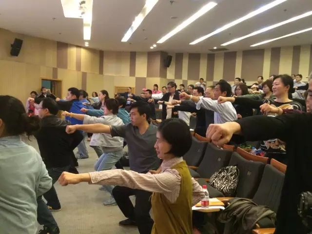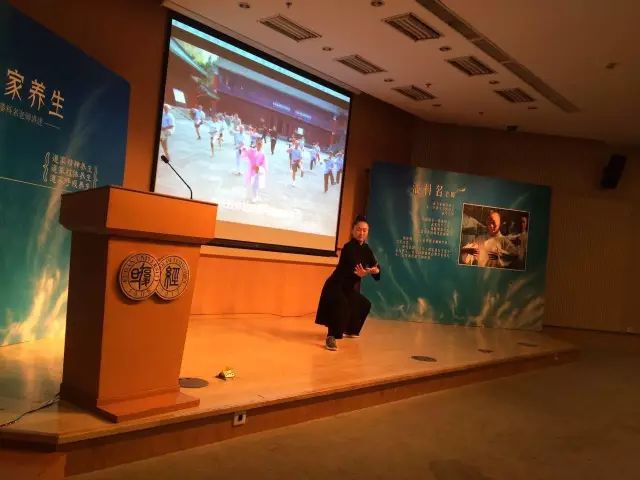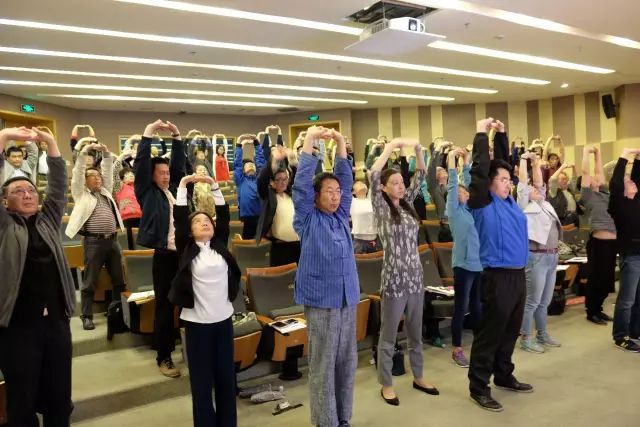 最后,是肢体层面的养生。肢体养生主要包括导引按摩和功法养生。导引是通过肢体运动锻炼达到疏通经络,调理气血的效果。按摩则主要压揉摩人体的经络穴位,以舒经活络,消除疲乏,或开郁解滞,防病祛疾。潘老师的养生方法是十二段锦,并给大家演示了第一式“双手托天理三焦”和第六式“攒拳怒目增气力”。