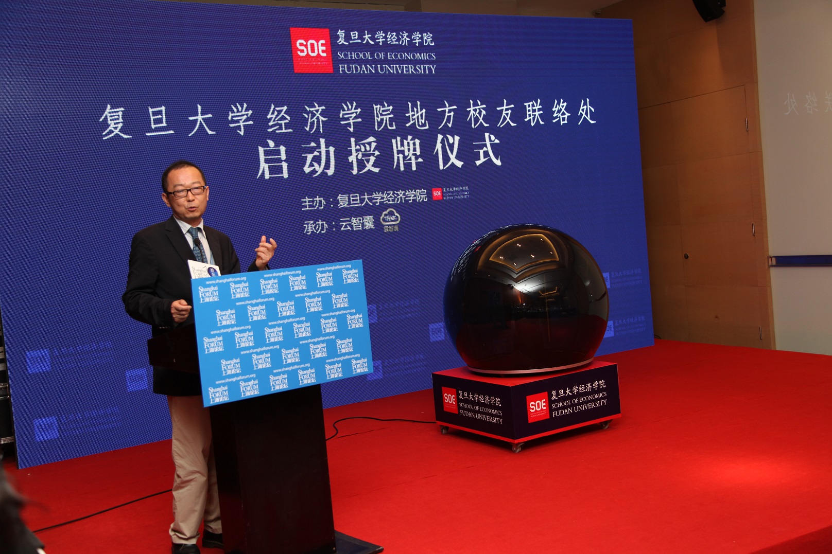 (School of Economics)的缩写外,张军院长还特地向与会嘉宾介绍了其另一层含义: ”SOE”三个字母的读法音译为汉语读音类似于“守益”,守即守护,利即利益,而经济研究是研究利益的,故“守益”即可理解为坚持不懈地研究、钻研经济学。