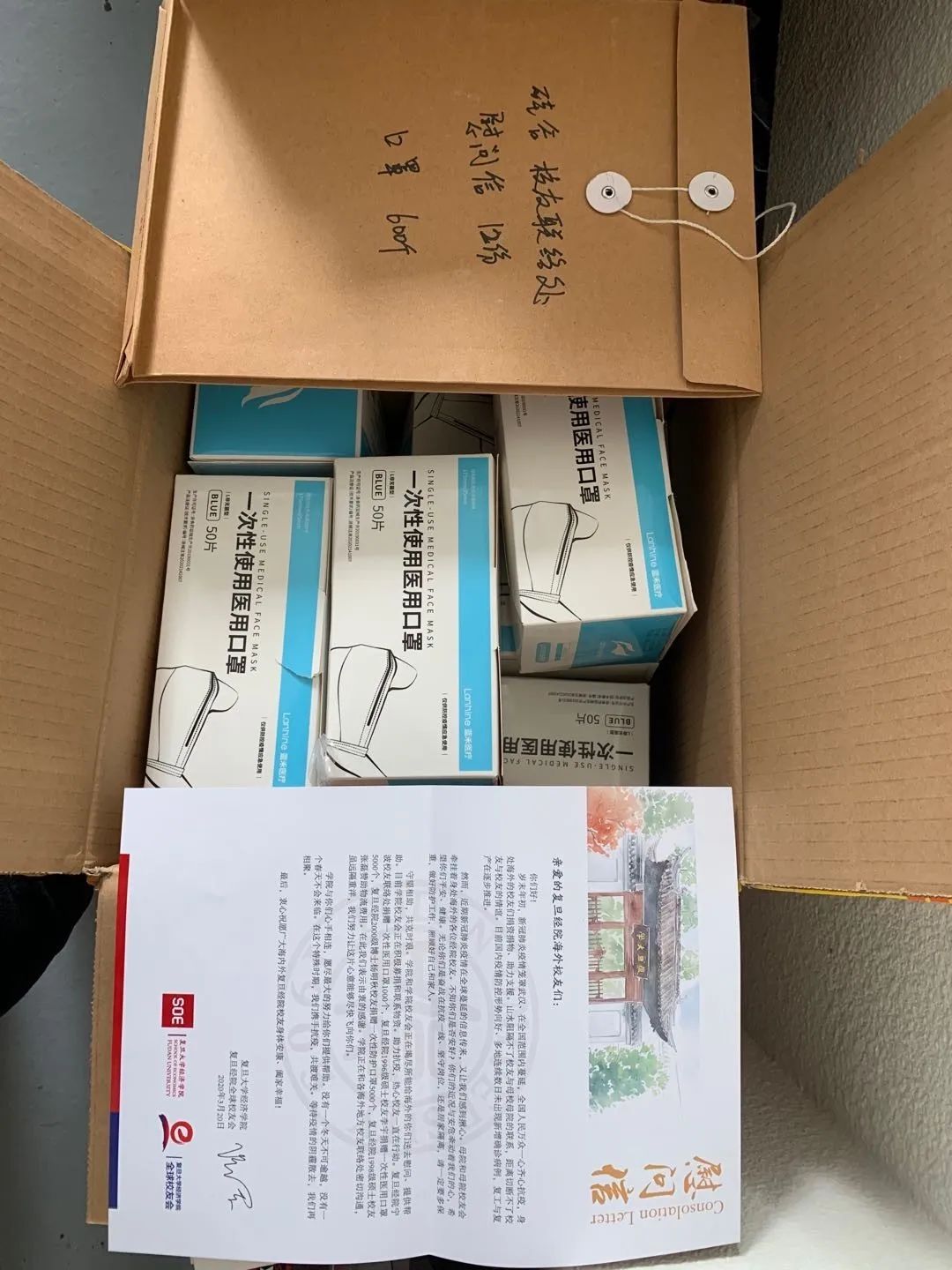 12个海外校友联络处沟通对接,了解当地情况和校友需求,积极组织募捐,紧急联系抗疫物资。在克服了抗疫物资紧缺、货源无可靠保证、到货时间不确定、海外邮寄物流关卡重重等问题后,经多方筹措沟通,得益于诸位经院校友的热心支持,我们用最快的时间募集到了一批一次性医用口罩并于3月23日将首批物资安排寄出。与口罩一起送出的还有来自母院饱含关切和祝福的慰问信。运送物资期间又遭遇了诸如德国海关临时扣押口罩、需要提供购买发票和订单才能办理清关手续等担忧,再次感谢多位校友的帮助和支持,所有人翘首期望着口罩能顺利到达。