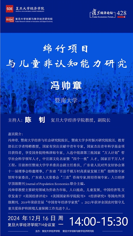 冯帅章, 暨南大学经济与社会研究院院长,暨南大学乡村振兴研究院院长, 教育部长江学者特聘教授,国家有突出贡献中青年专家,国家杰出青年科学基金项目获得者,享受国务院特殊津贴专家,入选中组部第三批国家“万人计划”哲学社会科学领军人才,中宣部文化名家暨“四个一批”人才,国家百千万人才工程。目前担任暨南大学学术委员会副主任委员,广东省人民对外友好协会第十一届理事会特邀理事,广东省“百县千镇万村高质量发展工程”指挥部专家智库专家委员,广东省人大常委会“三农”咨询专家,财经咨询专家。人口经济学顶级期刊《Journal of Population Economics》联合主编。冯帅章教授主要研究领域为劳动力市场,人口流动,儿童发展,中国经济等,文章发表于《美国经济评论》《美国国家科学院院刊》《经济研究》等国内外顶级期刊, 2019年荣获首届“中国青年经济学家奖”。2021年获评全国农村留守儿童关爱保护和困境儿童保障工作先进个人。