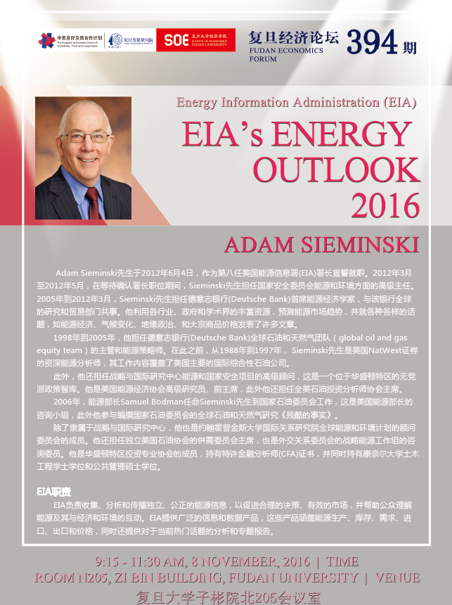 Adam Sieminski先生于2012年6月4日,作为第八任美国能源信息署(EIA)署长宣誓就职。2012年3月至2012年5月,在等待确认署长职位期间,Sieminski先生担任国家安全委员会能源和环境方面的高级主任。2005年到2012年3月,Sieminski先生担任德意志银行(Deutsche Bank)首席能源经济学家,与该银行全球的研究和贸易部门共事。他利用各行业、政府和学术界的丰富资源,预测能源市场趋势,并就各种各样的话题,如能源经济、气候变化、地缘政治、和大宗商品价格发表了许多文章。 1998年到2005年,他担任德意志银行(Deutsche Bank)全球石油和天然气团队(global oil and gas equity team)的主管和能源策略师。在此之前,从1988年到1997年, Sieminski先生是美国NatWest证券的资深能源分析师,其工作内容覆盖了美国主要的国际综合性石油公司。