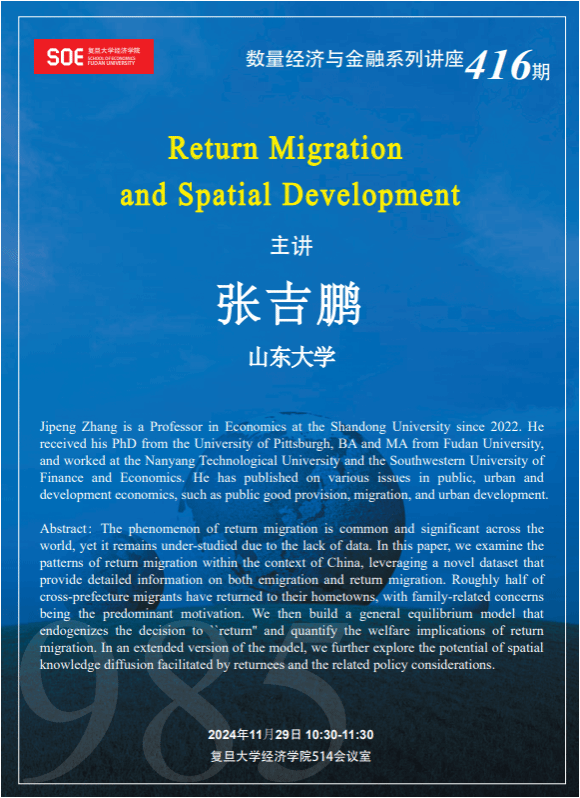 Abstract:The phenomenon of return migration is common and significant across the world, yet it remains under-studied due to the lack of data. In this paper, we examine the patterns of return migration within the context of China, leveraging a novel dataset that provide detailed information on both emigration and return migration. Roughly half of cross-prefecture migrants have returned to their hometowns, with family-related concerns being the predominant motivation. We then build a general equilibrium model that endogenizes the decision to ``return'' and quantify the welfare implications of return migration. In an extended version of the model, we further explore the potential of spatial knowledge diffusion facilitated by returnees and the related policy considerations.